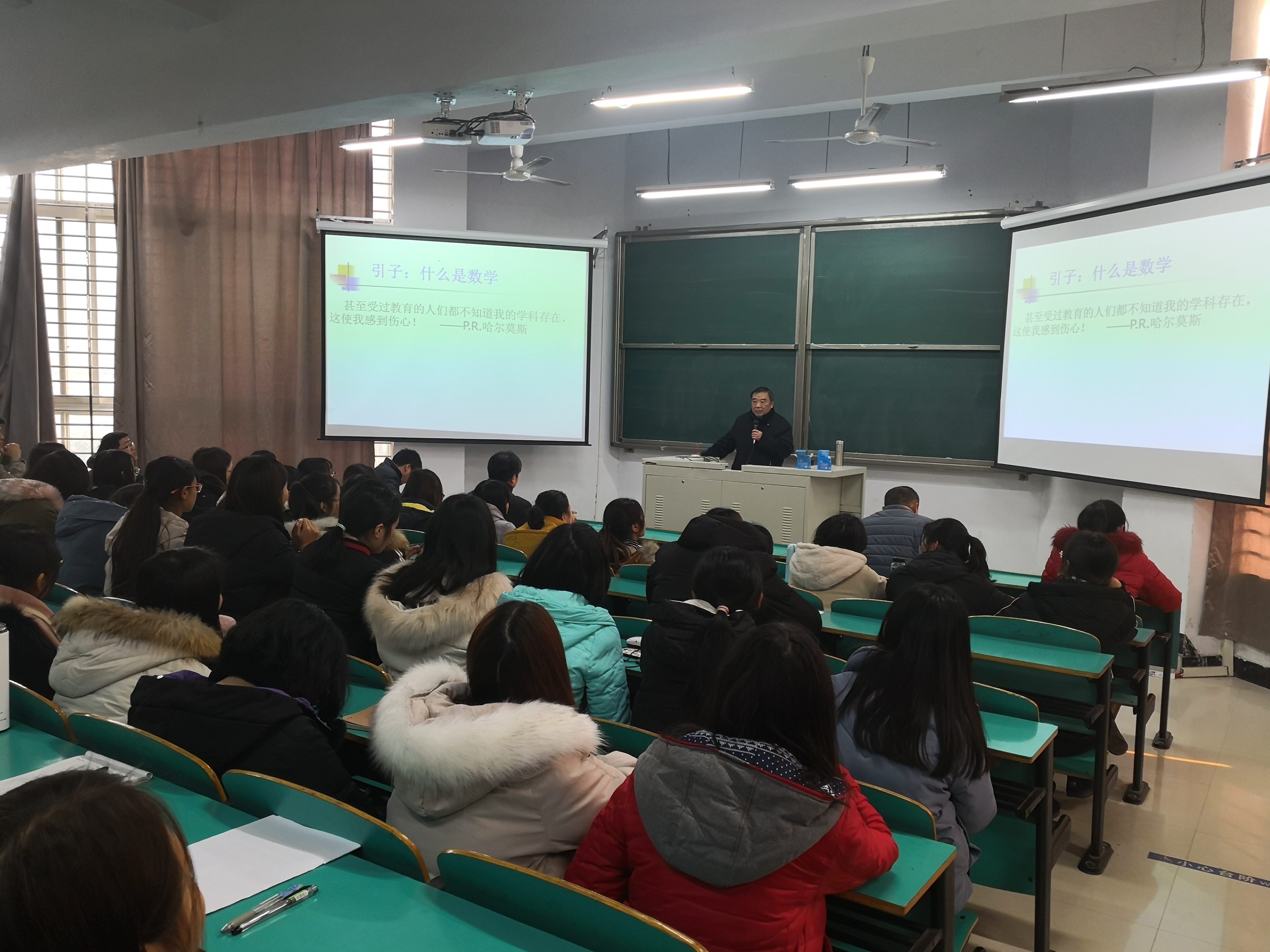 郝涌教授通过引述恩格斯等大师的名言,阐述了数学的概念;简要介绍了数学发展的里程碑,如欧氏几何的创立,微积分的创立,非欧几何的创立,实数的完备性等,他从非欧几何的角度,与师生交流了关于宇宙大爆炸、天体物理等科学问题的独到见解;数学演绎的基础,简单介绍了集合论等知识;他还以树叶覆盖地面等朴素生动的例子,解释了有限覆盖等六大定理,引导师生在教学和学习中认真感悟数学的精妙与奇美。