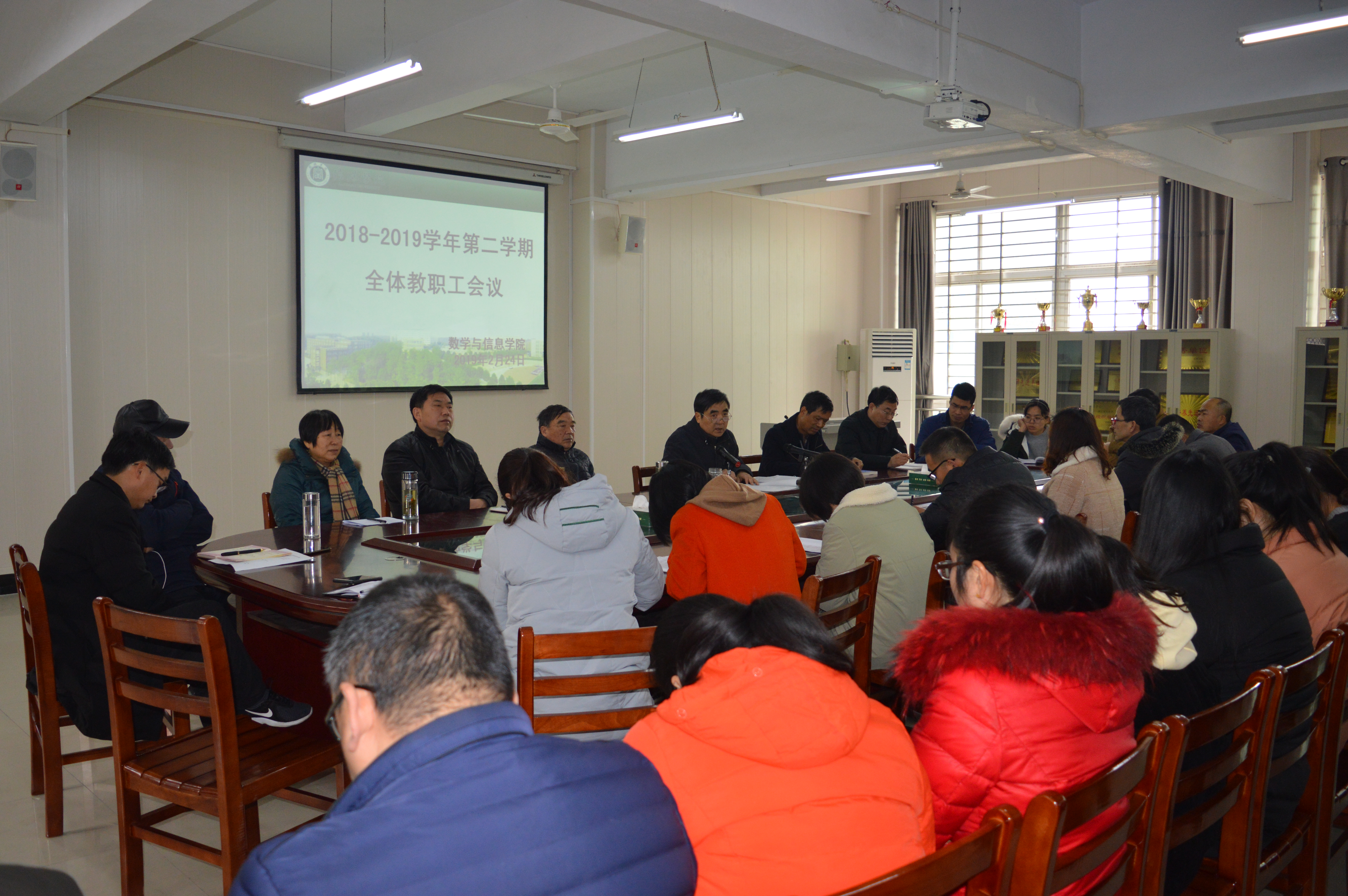 2月24日下午,数学与信息学院新学期全体教职工会议在数计楼407会议室召开,院长俞迎达、党总支副书记李平、教学秘书毛凤翔、行政干事闫珍珠及全体教师参加了会议。