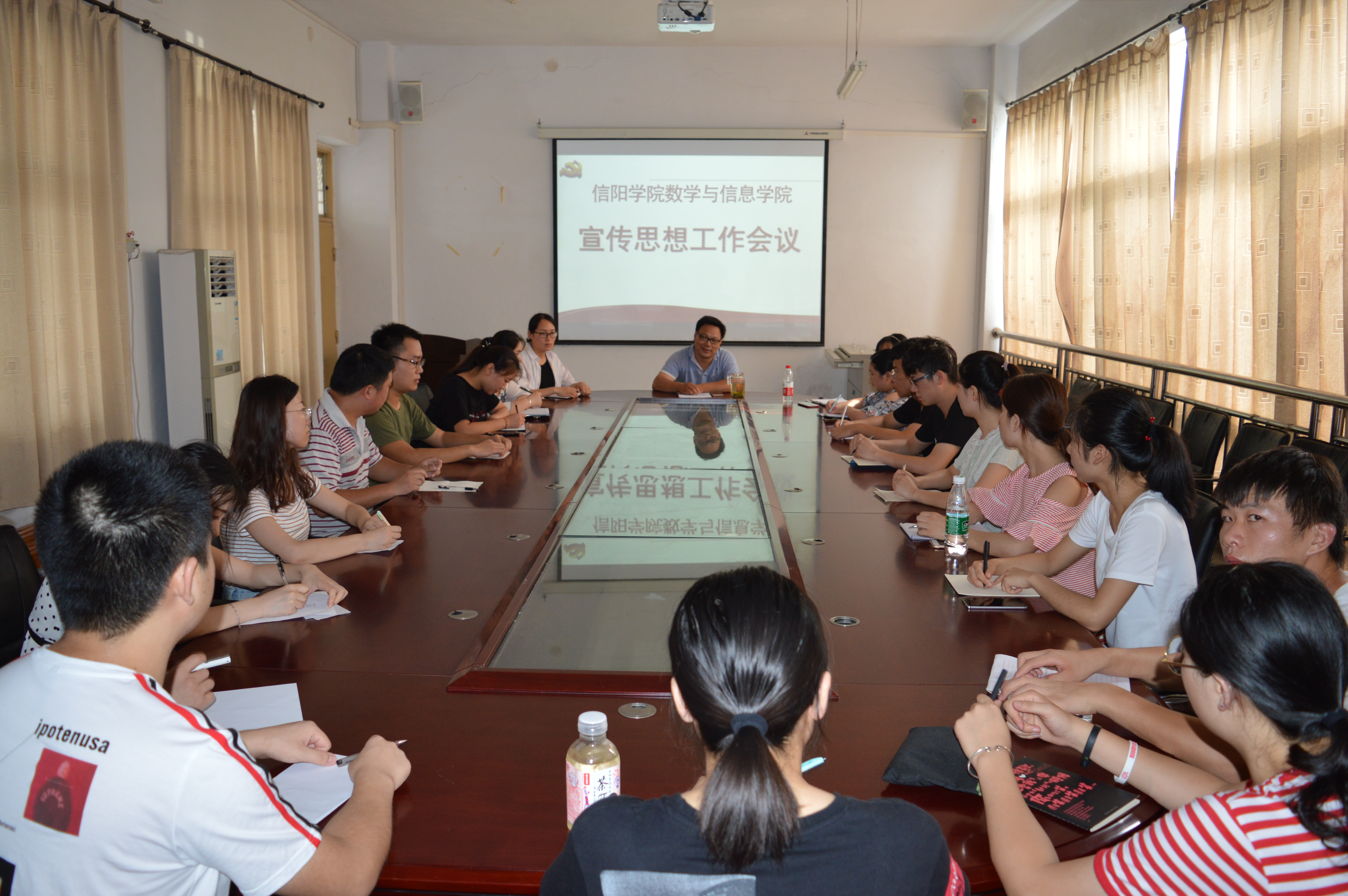6月28日下午,数信学院2017-2018学年宣传思想工作总结会在数计楼510会议室召开。党总支书记张俊忠,党总支委员、行政干事闫珍珠,学生一支部书记何珊珊,学生二支部书记司杰,辅导员徐雪涵和新媒体中心、团总支宣传部、院学生会新闻通讯部全体成员参加会议。