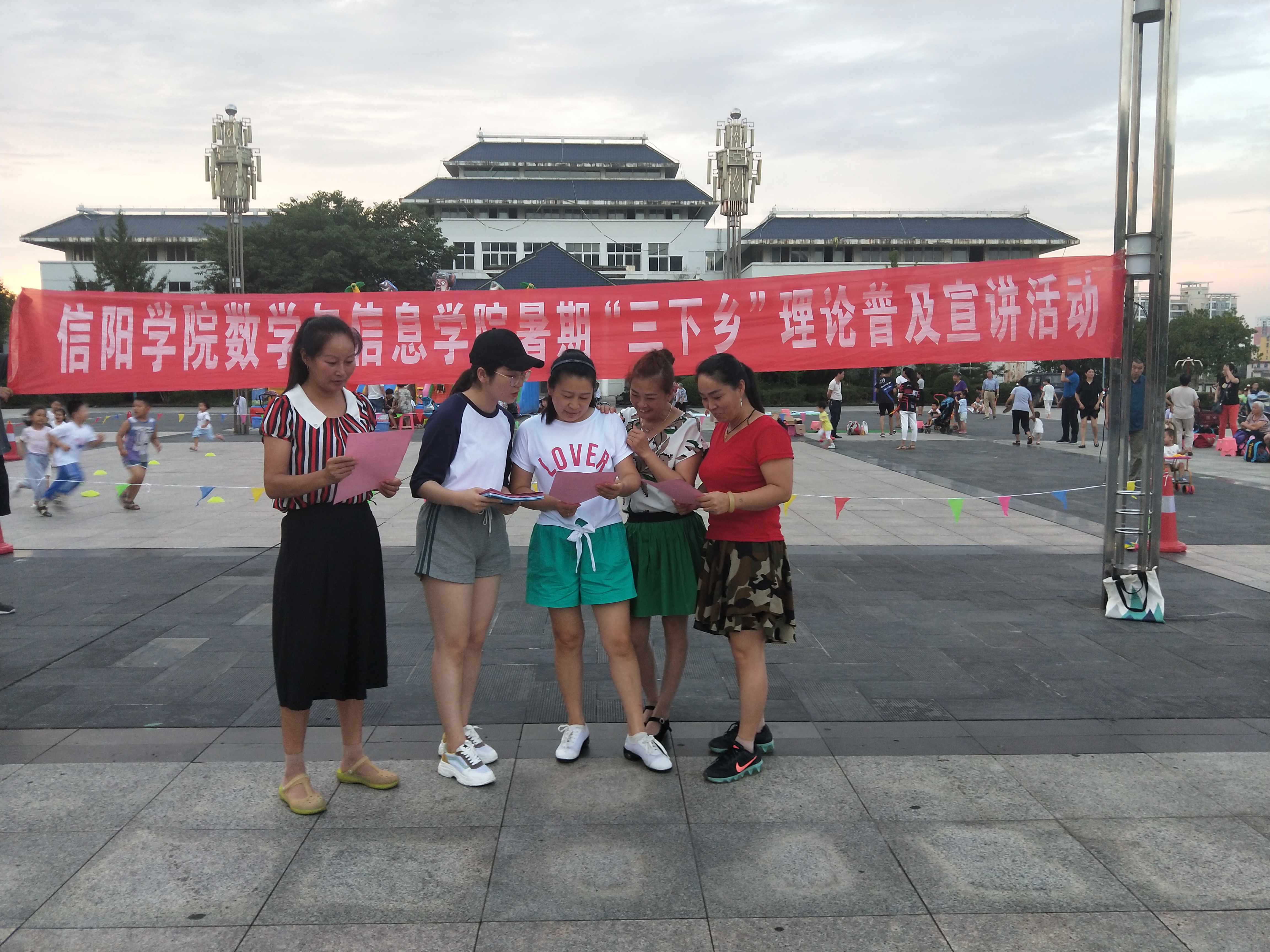 为扎实推动党的创新理论成果深入人心,切实把党的十九大精神落到实处。7月6日,数学与信息学院团总支书记王晶带领暑期“三下乡”社会实践队一同前往茗阳广场就党的创新理论进行宣传。