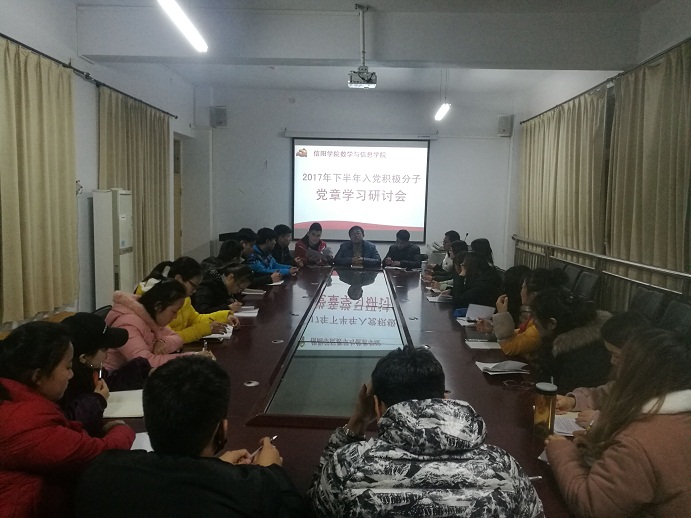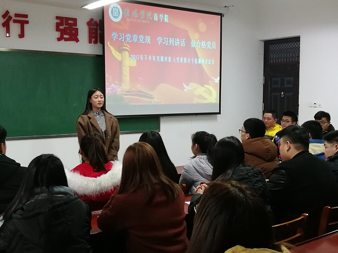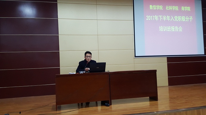 12月17日下午,商学院党总支书记张富庄、社会科学学院党总支书记李赟、数学与信息学院党总支书记张俊忠分别以《认真学好党章,自觉遵守党章》、《坚持两学一做,加强党性修养》、《学懂弄通做实党的十九大精神,勇做新时代的弄潮儿》为题作辅导。张富庄结合中央党校谢春涛教授十九大党章公开课视频资料,对党的指导思想、性质、宗旨和新时代党的历史使命等作了详细解读,要求大家全面掌握党章基本内容,深刻领会党章的基本原则和精神实质,增强党章意识,边学习边思考边实践,做到学以致用、学用相长。李赟要求大家充分认识加强党性修养的重要性,把加强党性修养看作立身立业立言立德的基石,按照“基础在学、关键在做”的原则,以党章为镜培育“党心”、规范“党行”、牢记“党姓”,做到心中有所畏、言中有所戒、行中有所止,争取早日加入党组织。张俊忠从从新时代特征、三大规律深化、主要矛盾历史性转化、中华文化立场坚守等七方面进行解读,要求大家自觉强化政治责任,大力弘扬理论联系实际的学风,着眼大处、盯住难处、触及深处、严格自律,争做勤奋学习、遵规守纪、增强团结、弘扬传统的表率。