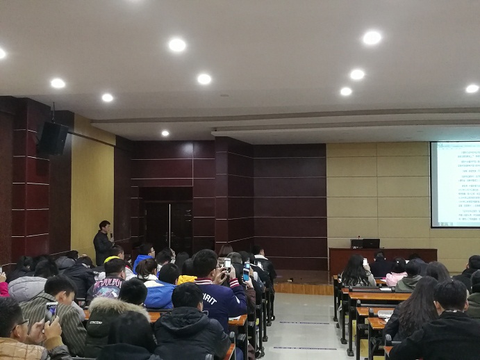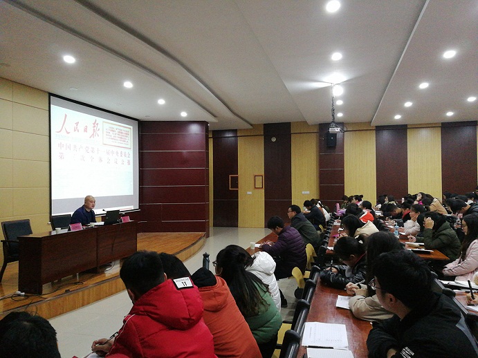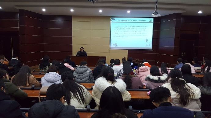 12月14日下午,信阳农林学院牧医工程学院党总支副书记黄立教授应邀在图书馆102学术报告厅作了题为《学习新时代思想,争做新时代青年》的辅导报告。他从习近平新时代中国特色社会主义思想的丰富内涵、基本方略、形成来源、历史贡献四个方面进行了全面、系统、生动的论述,勉励大家以青年习近平的成长经历为榜样,以习总书记在十九大报告中提出的“有理想、有本领、有担当”为标准严格要求自己,勇敢肩负起时代赋予的重任,努力在实现中国梦的生动实践中放飞青春梦想,在为人民利益的不懈奋斗中书写人生华章。报告由商学院党总支书记张富庄主持,数学与信息学院党总支书记张俊忠和文学院、社会科学学院、数学与信息学院、商学院2017年下半年党员发展对象和入党积极分子200余人聆听报告。