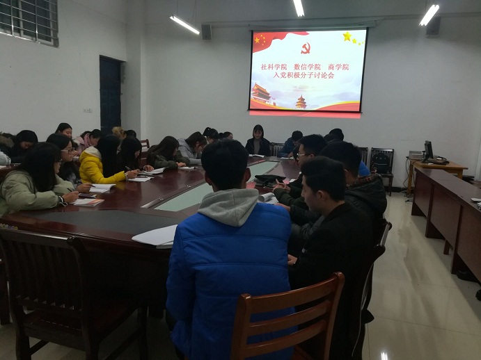 12月19日晚,社会科学学院、数学与信息学院、商学院三个学院党员发展对象和入党积极分子重新组合在社科楼102会议室、社科楼407会议室、商学院金融证券实验室、数计楼510会议室开展分组学习讨论。大家结合学习、工作与生活实际,畅谈学习认识,交流思想体会,达到了相互启发,共同提高的目的。
