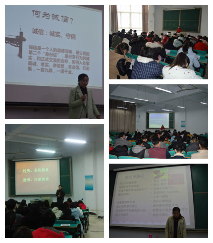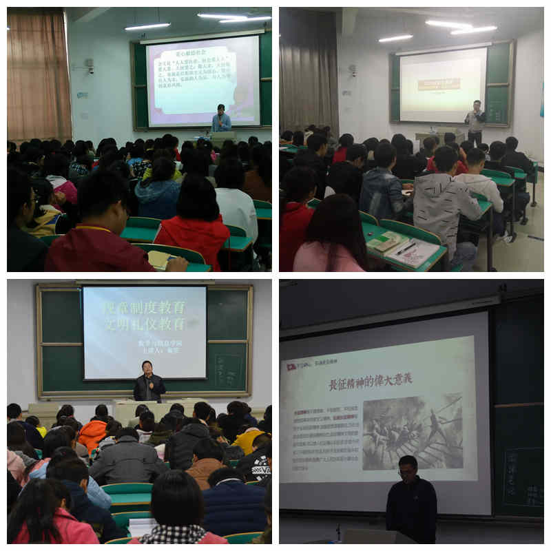 司杰老师以“五心”教育为主题开讲,让同学们理解“五心”的含义并在以后的生活中做到忠心献给祖国,爱心献给社会,关心献给他人,孝心献给父母,信心留给自己。周扬老师以“安全普法教育,提高防范意识”为主题,让同学们意识到安全教育的重要性,并保证将提高自身防范意识,增加自我防范能力。秦笠老师则针对“规章制度教育,文明礼仪教育”给同学做出了详细介绍。并要求同学们要遵守规章制度,提高综合素质,实践文明礼仪,树立当代大学生新形象。黄冉冉老师对“大学生适应性教育”做出分析,从学校适应、学习适应、人际关系、心理适应、等方面,并对大学遇到的各种问题给出合理建议。黄鸿亮主席以“不忘初心,弘扬长征精神”,告诉同学们要谨记革命先辈的顽强拼搏、不屈不挠的长征精神,学习上也要持之以恒、天道酬勤。