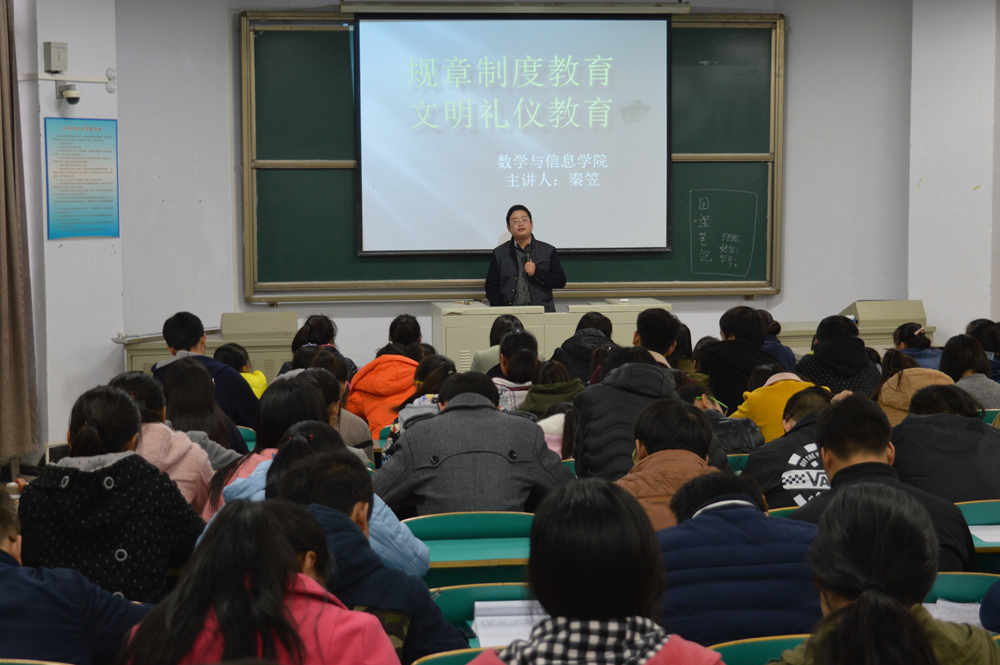 11月1日下午,数学与信息学院在数计楼107教室里组织召开了第三次新生团课,此次团课以“规章制度教育,文明礼仪教育”为主题。团课由院党总支副书记、行政秘书秦笠老师主讲。