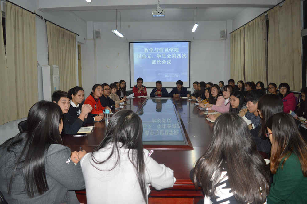11月14日晚,数学与信息学院团总支、学生会在数计楼506召开了第四次部长会议。会议由院团总支副书记黄鸿亮主持,团总支、学生会主席团,各部部长出席了本次会议。