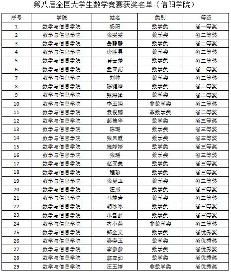 11月30日,第八届全国数学竞赛比赛结果揭晓,我校学子首次参赛并取得了优异成绩。其中获得河南省级赛区各级奖项总计29项,其中一等奖1项(数学类);二等奖10项(数学类8项,非数学类2项);三等奖13项(数学类12项,非数学类1项),优秀奖5项(数学类4项,非数学类1项)。