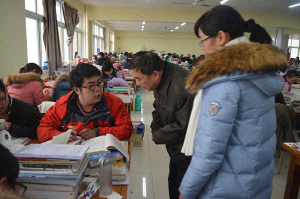 在图书馆自习室,郝涌教授询问了广大考研学生的备考情况,叮嘱大家要调整作息时间、保重身体、沉着应考。注意学院送考车辆的时间安排,尽量提前到考点了解考场情况。