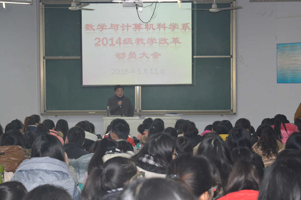 1月11日上午,数学与计算机科学系在数计楼106室召开2014级教学改革动员大会。系主任郝涌教授,系秘书、干事,全体辅导员及2014级全体学生参加了本次会议。