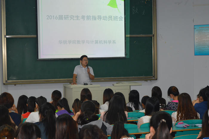 为调动学生考研的积极性,让学生更好的挖掘自己的潜力,得到更高层次的深造,2015年9月18日下午,数学与计算机科学系在数计楼106室召开了2016年研究生考前指导动员会。系行政秘书、党总支副书记秦笠老师、毕业班班主任司杰老师及200余名毕业班同学参加了本次会议。 大