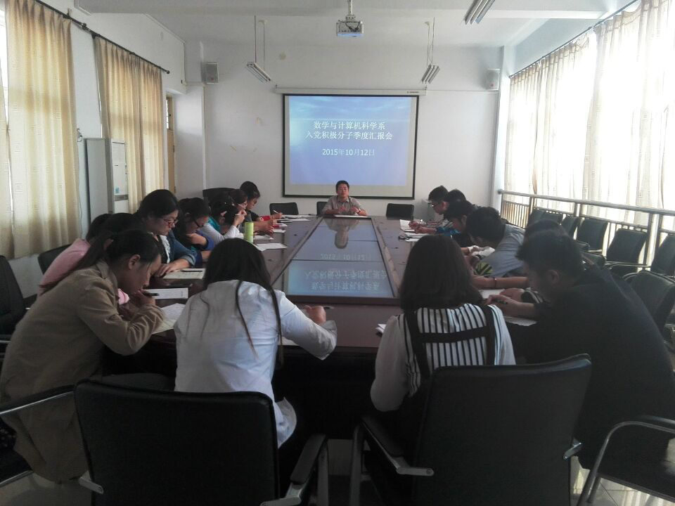 10月12日中午,数学与计算机科学系入党积极分子季度汇报会在数计楼510室召开。系党总支副书记、行政秘书秦笠,党总支学生助理郝静静及2014下半年入党积极分子参加了会议。