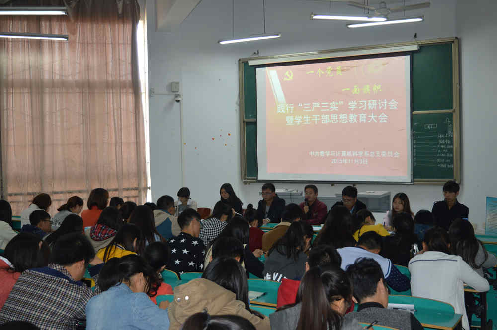 11月3日中午,数学与计算机科学系党总支在数计楼206室召开践行“三严三实”学习研讨会暨学生干部思想教育大会,部署本学期我系党建和思想政治工作。系党总支副书记、行政秘书秦笠,党总支学生助理张建立、郝静静、孔豪杰、裴雅琼,学生党支部委员,全体学生党员,第八届学生会主席团成员及主要学生会干部, 2014级和2015级各班班长、团支书参加了本次会议,会议由郝静静主持。