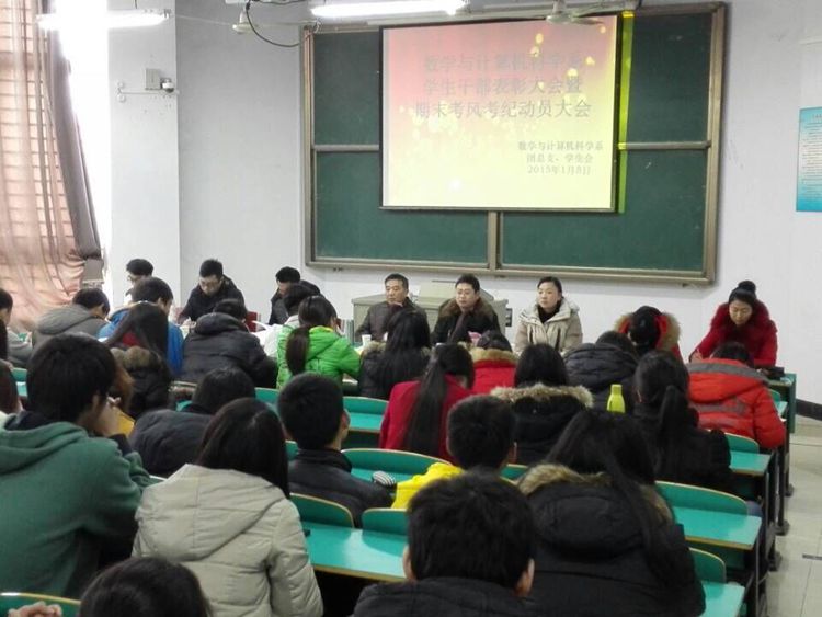 2015年1月8日中午,数学与计算机科学系在数计楼106室召开了学生干部表彰大会暨期末考风考纪动员大会。系主任郝涌教授;系秘书余兴旺、秦笠;辅导员李平、王晶、司杰、周扬;系团总支、学生会全体成员及各班班长、学习委员参加了本次会议。大会由秦笠主持。