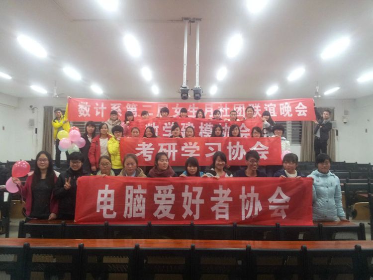11月28日晚,由数计系社团部主办,由电脑爱好者协会、数学建模协会、考研学习协会联合承办的数计系女生月社团联谊晚会在图书馆102室举办。数计系学生会主席团成员,数计系学生会社团部,各协会及其他工作人员及兄弟协会负责人观看了本场晚会。