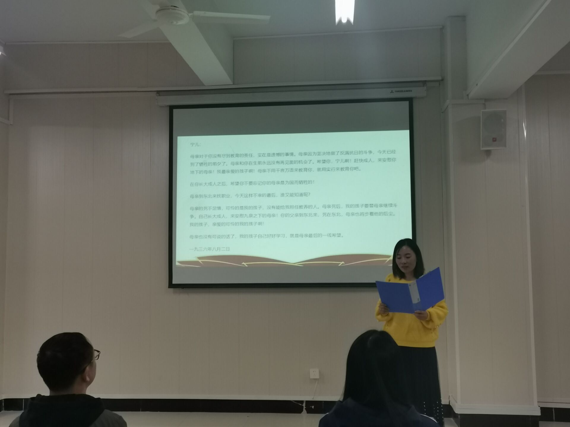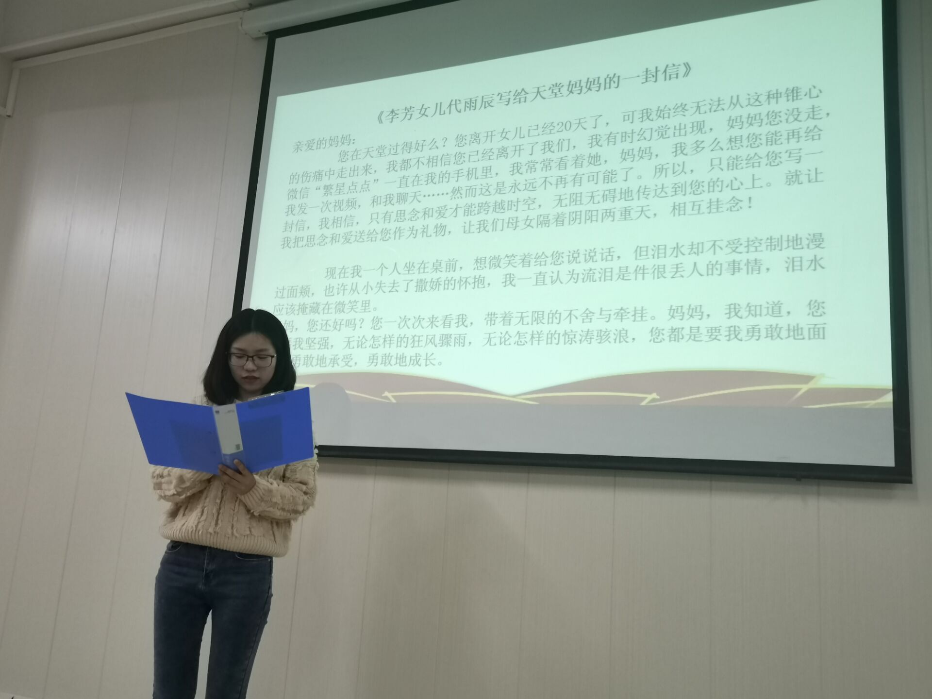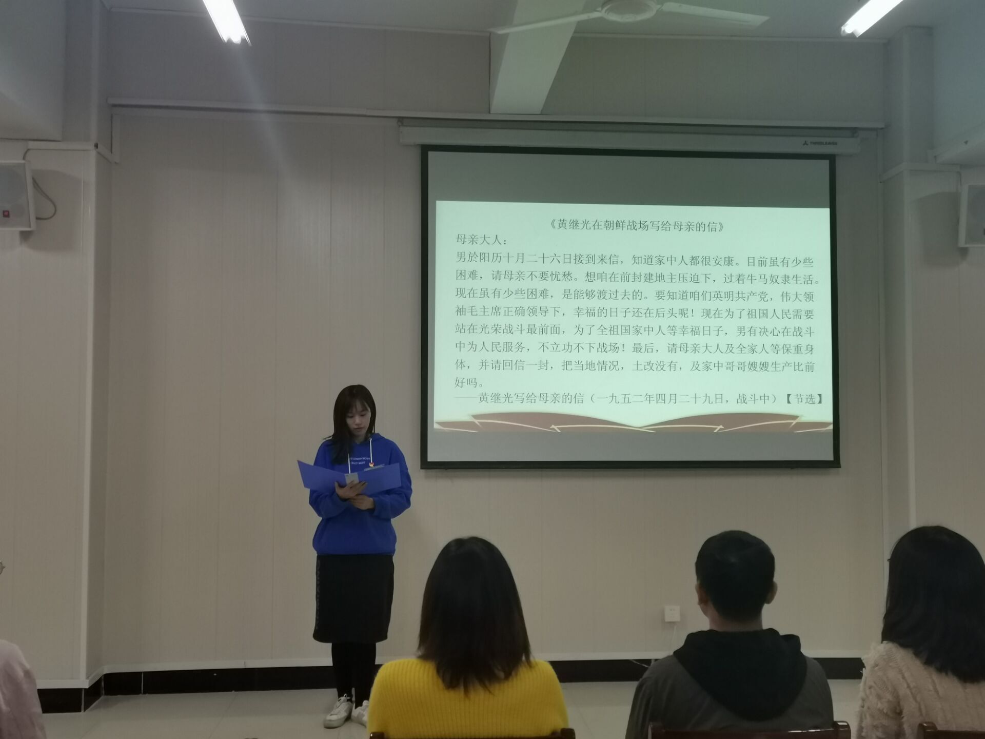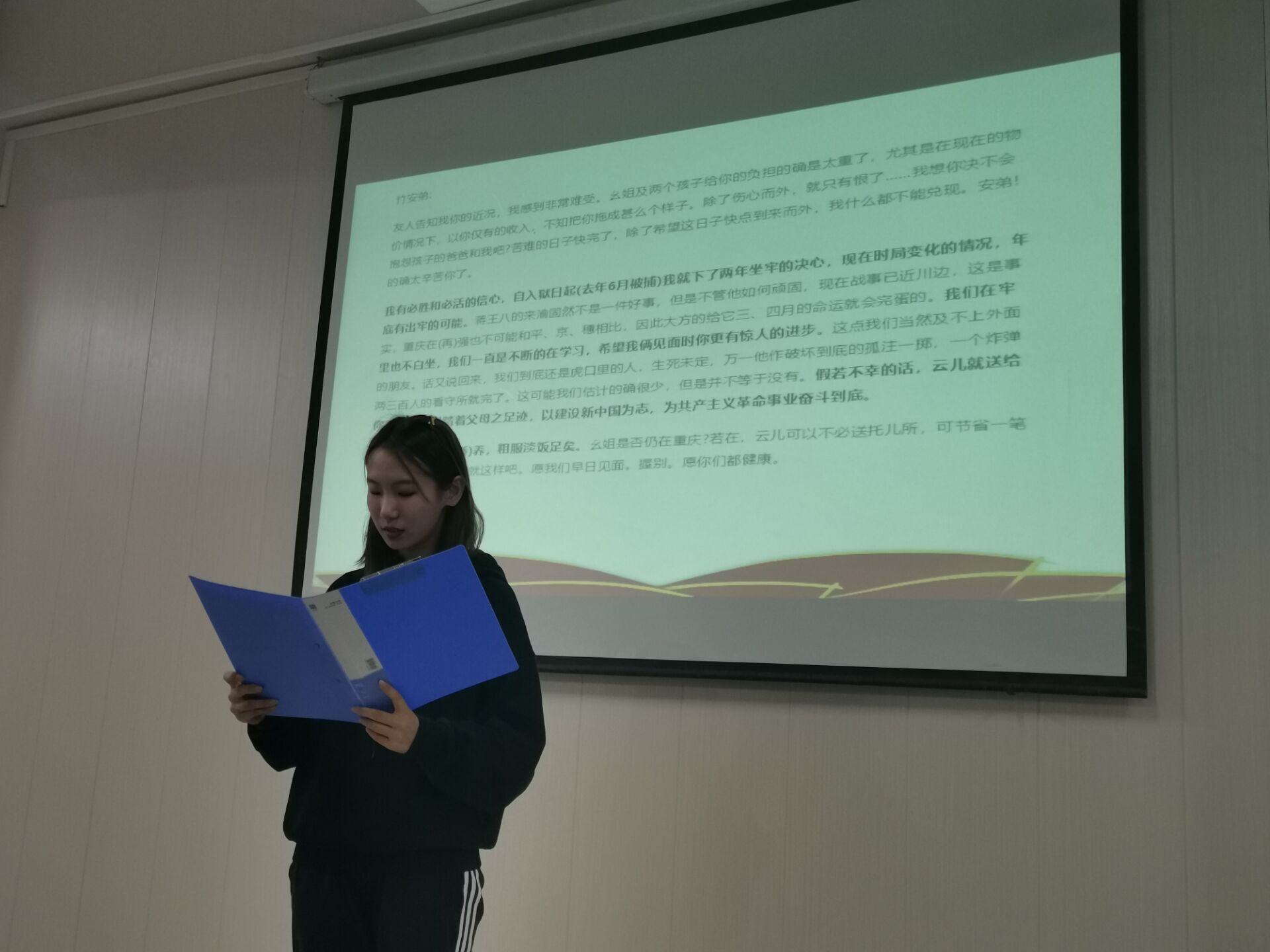 诵读活动由李平坚毅铿锵地诵读《赵一曼在狱中写给孩子的遗书》拉开序幕,接着闫珍珠老师诵读了吴先恩英勇就义前的向党告别的一份信,即《大别山将军——吴先恩临终前向党告别》,满怀深情,感染力强。朱纪诚老师诵读了《江姐在渣滓洞狱中的托孤信》,石孟晓老师诵读了《黄继光在朝鲜战场写给母亲的信》,随后杨雪老师深情并茂地诵读了《李芳女儿代雨辰写给天堂妈妈的信》,学生代表张紫钰诵读了《小战士张钊抗洪间歇写给母亲的信》。