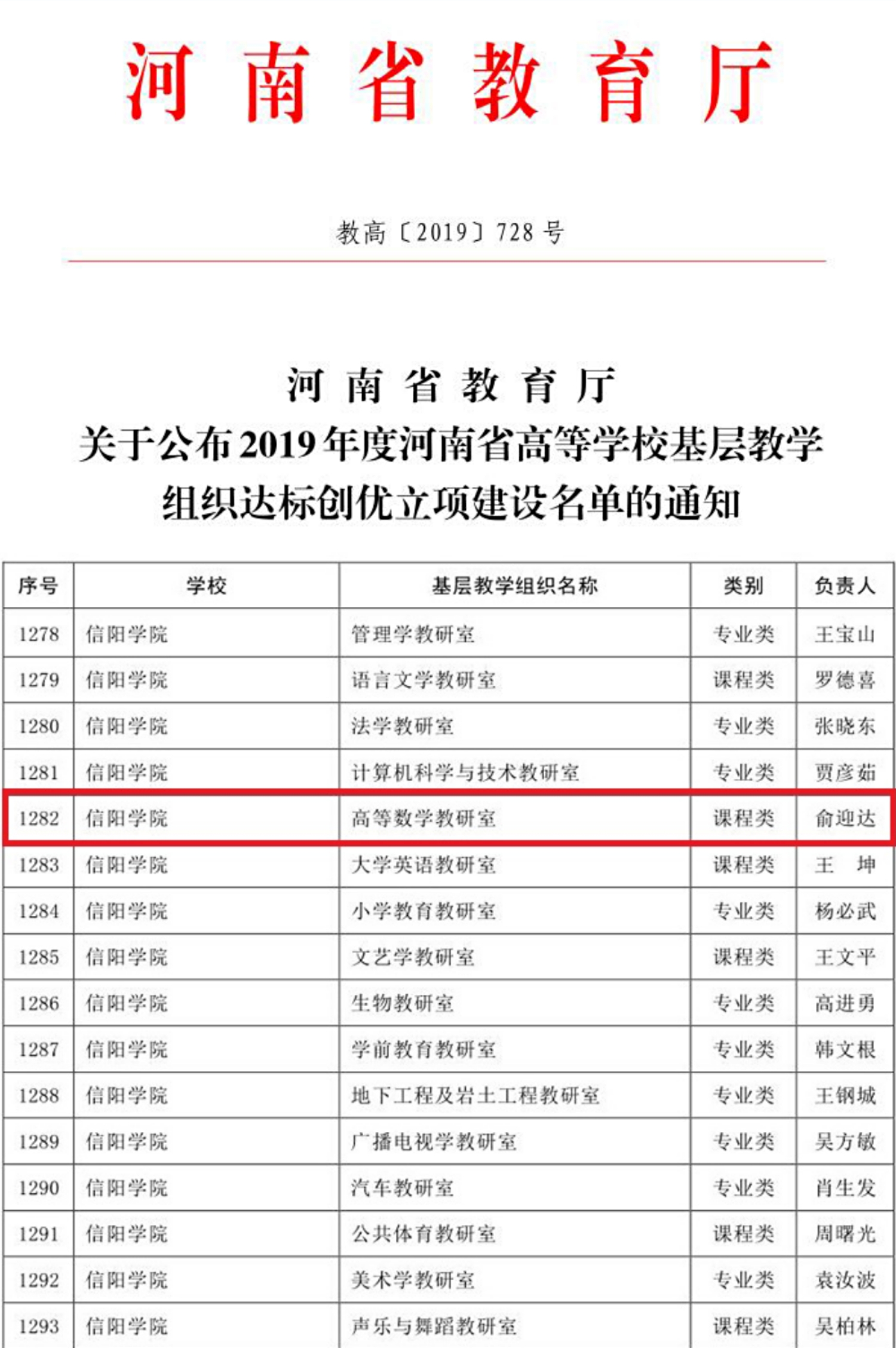 河南省教育厅发布《关于公布2019年度河南省高等学校基层教学组织达标创优立项建设名单的通知》(教高〔2019〕728号),我院高等数学教研室获批2019年度省级合格基层教学组织备案。至此,我院省级合格基层教学组织建设项目已有2个。
