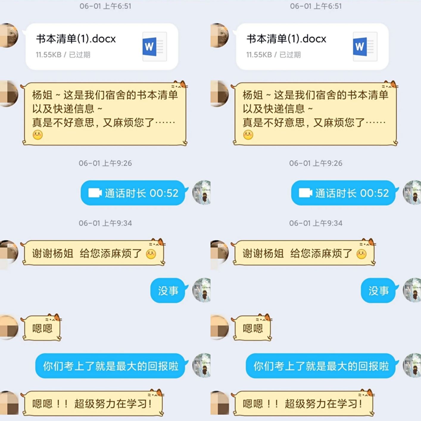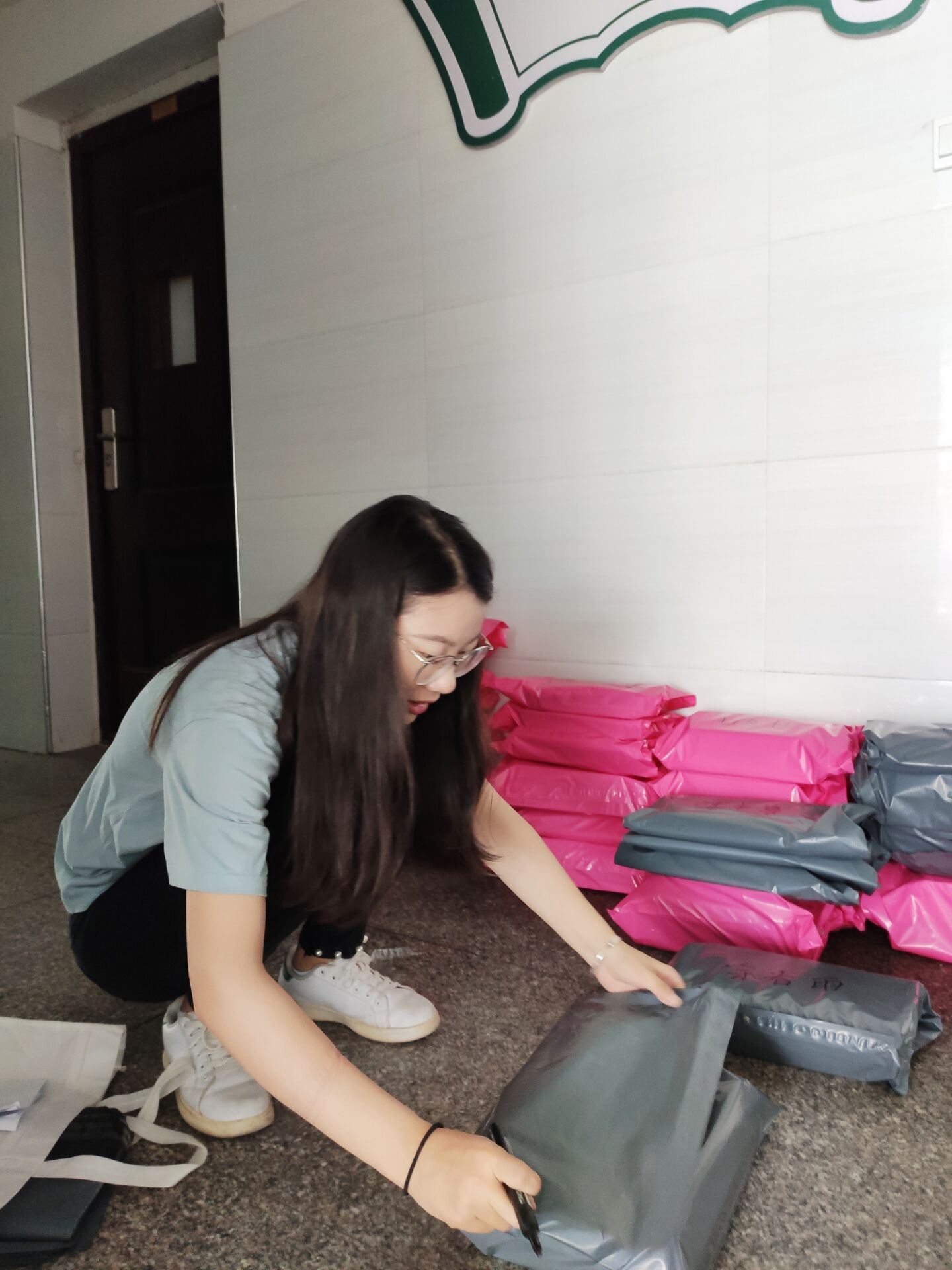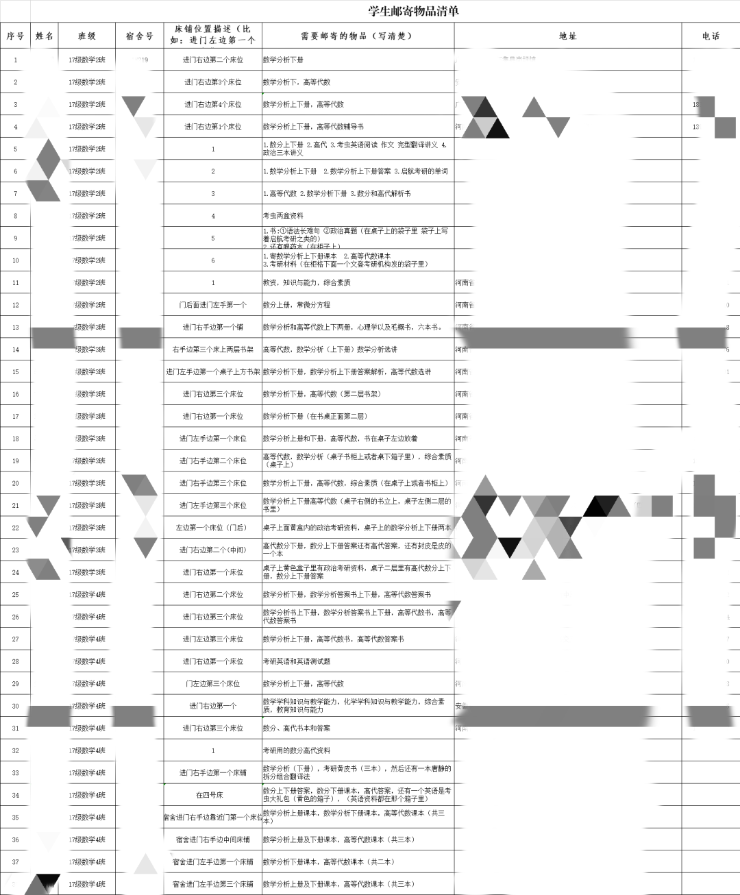 从5月18日返校办公开始,我院党总支副书记李平、辅导员杨雪和李婷老师以班级为单位,收集学生需要邮寄的物品信息,统计联系方式和家庭地址,确定物品所在的宿舍号和物品位置,形成了邮寄物品清单。随后,辅导员们在线“云接单”,在学校公寓办的配合下,在得到同学们的允许后,打开宿舍的门,为学生们整理物品。从女寝到男寝,从一楼到六楼,辅导员们忙碌的身影在各楼层之间穿梭。在寝室物品整理工作中,辅导员老师还通过电话、网络视频与学生进行面对面交流,再次确认需邮寄的物品,以及这些物品的位置,并细心填写、核对收货地址、联系方式,顺利完成物品的打包、搬运工作,确保快递员无误地将物品邮寄到学生的手中。整个过程复杂却井然有序地进行着,每本书、每份包裹都倾注了老师们对每一名学生的浓浓关爱和殷实的关怀,他们用汗水和劳动体现对学生们的责任与担当。