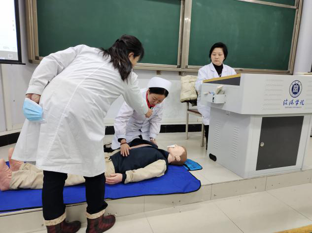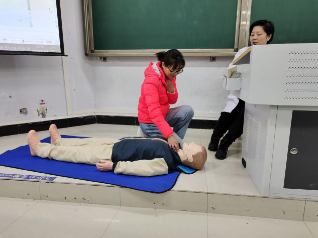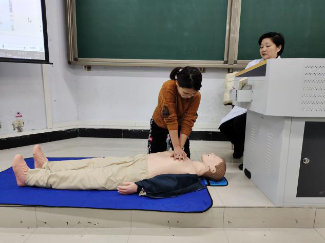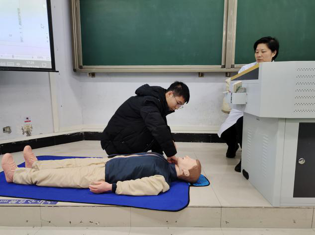 同学们纷纷踊跃到模型前面进行现场情况的实战模拟,尽管学生都听的很认真,但在实践过程中还是有或多或少的错误发生,此时校医院穆医生在一旁耐心的为同学们纠正着错误,直到同学们对这项救助技能真正掌握为止。一时,大家互相探讨,互相学习,场面极其感动。