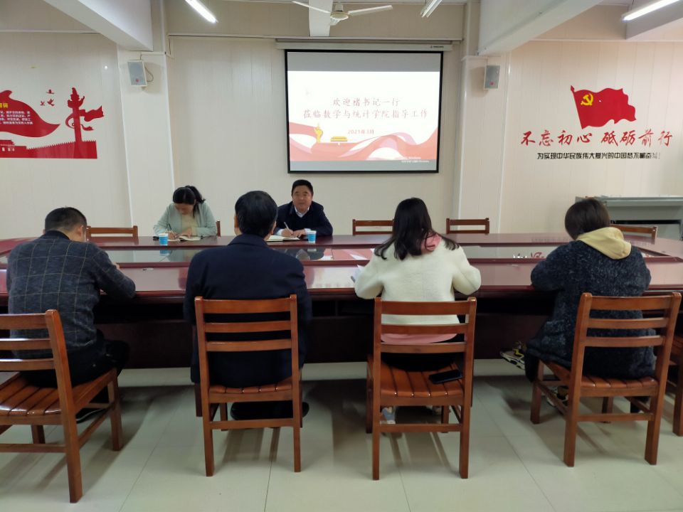 褚金海认真听取了汇报,充分肯定了学院的办学思路和取得的成绩,针对学院目前存在的困难给予了针对性指导和建设性意见。他指出,数学学科是大学办学的重要基础学科,是理工科办学的重要基础。学院要进一步加强师资引进,建团队,找方向,使教师做到教研相长;进一步加强学生深造的组织动员,做好指导和服务,提高升学率;要围绕学校中心任务开展党建工作,重视党史学习,营造政治氛围,结合学院特色打造党建工作品牌,推动教育教学事业再上新高。