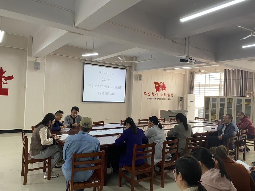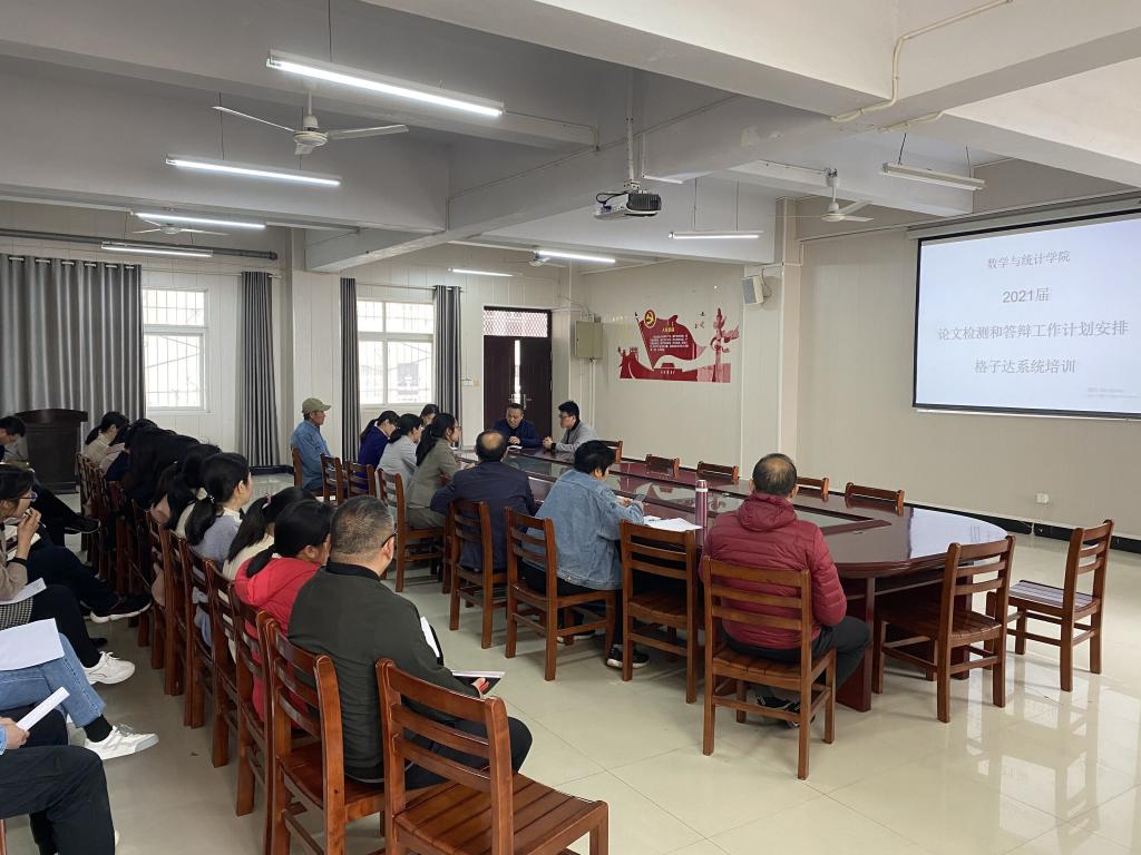 为确保2021届毕业论文检测工作、答辩工作顺利开展,以及学院老师熟悉并正确使用格子达论文检测系统的相关功能。4月13日下午,老太阳集团8722在数计楼407会议室召开论文检测和答辩工作计划以及格子达系统培训会议。学院党总支副书记刘颖方、教学副院长张聪、学院全体老师参加了此次会议,会议由张聪副院长主持。