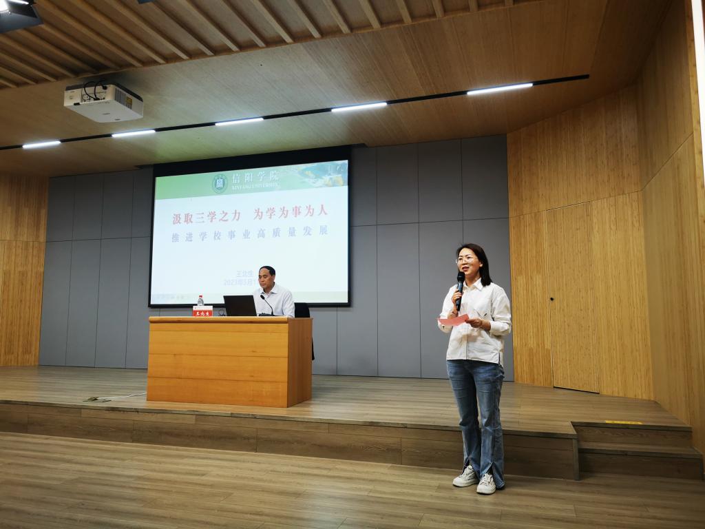 他指出,广大青年教师在为学上要研究真问题,着眼世界学术前沿和国家重大需求,致力于解决实际问题,善于学习新知。在为事上要坚定信念,始终同党和人民站在一起,自觉做中国特色社会主义的坚定信仰者和忠实实践者。在为人上要严爱相济、润己泽人,以人格魅力呵护学生心灵,关注全体学生。希望大家不断提高自身能力,站稳讲台,站好讲台,时刻牢记立德树人根本任务,争做信阳学院的“大先生”。
