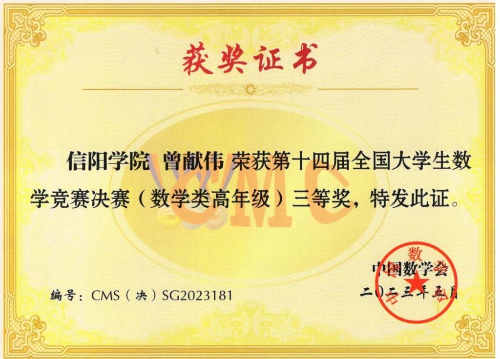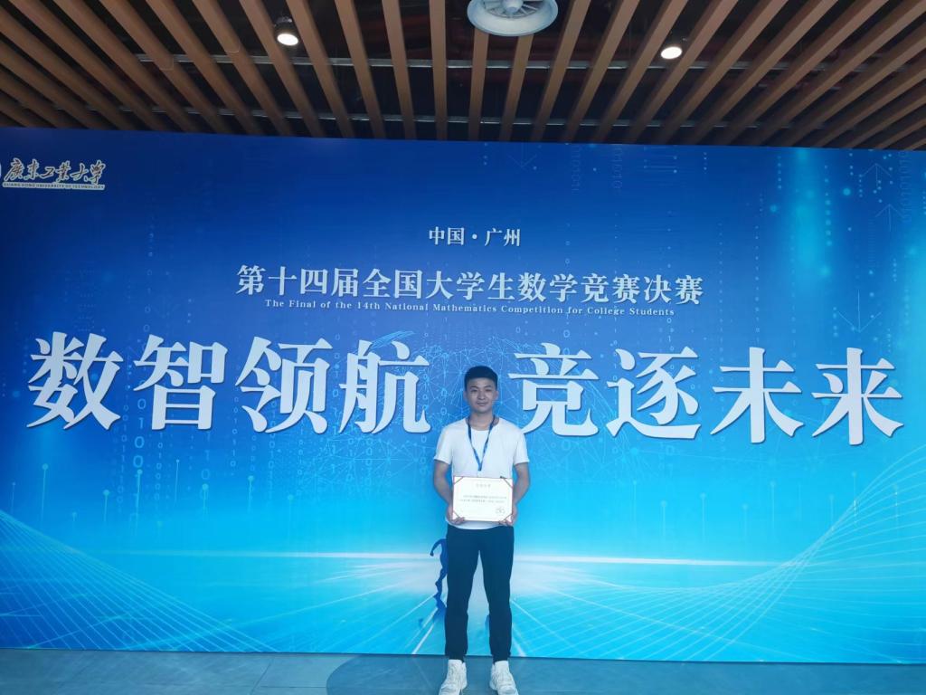 近日,第十四届全国大学生数学竞赛决赛在广州工业大学举行。经过激烈比拼,我院2020级数学与应用数学本科5班学生曾献伟同学荣获国家级三等奖,取得了我校参赛以来的最好成绩!