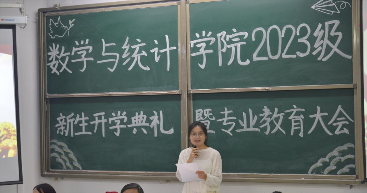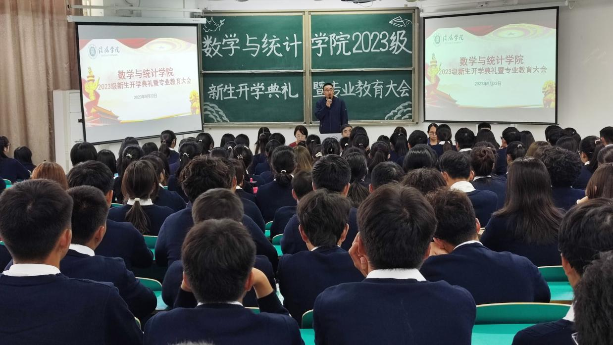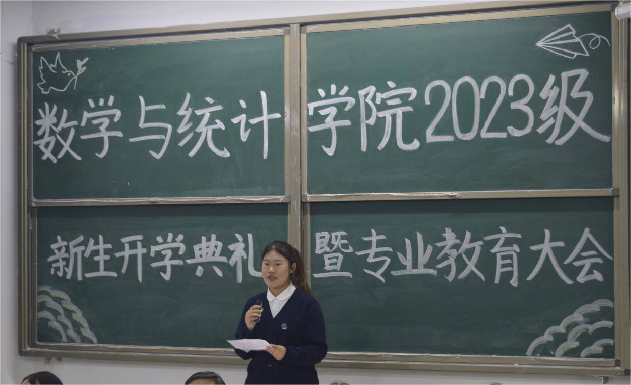 典礼开始,刘颖方代表学院全体教职工向2023级全体新生表示欢迎和祝贺,河南省文明教师、数学分析教研室主任王玉磊,老生代表李析,新生代表张心雨分别进行了发言。