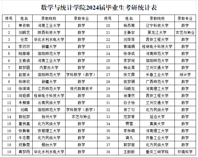 星光不问赶路人,时间不负有心人。随着2024年全国硕士研究生招生录取结果陆续公示,我院考研捷报频传。我院2024届毕业生共计385人,其中有220人报考了研究生,报考率57.1%,其中过线人数57人,38人被录取,考研录取率10%。其中张琳欣、郭梦圆等4名同学被新疆大学、南昌大学等211、“双一流”院校录取,同时涌现出2#416、2#434等考研明星宿舍。
