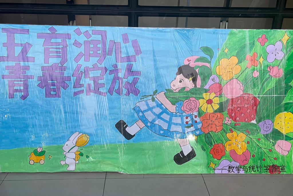 5月12日—5月25日,我院展出心理健康宣传板,展板表明“五育润心,青春绽放”心理健康月主题,并在数计楼大厅展览。