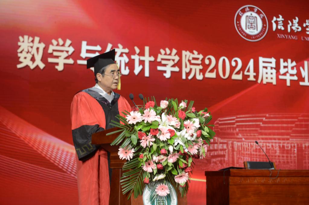 院长俞迎达发表毕业致辞,他指出,2024届毕业生见证了母校的繁荣发展,在求学生涯中取得了骄人的成绩,向2024届毕业生表示最热烈的祝贺,在同学们即将远航之际,对大家提出三点希望,一是要胸怀家国、信仰坚定,做一个志向远大的人,把自己所学到的本领运用到加快建设教育强国的伟大实践中,将自己的职业发展融入到强国建设、民族复兴、人民幸福的伟大事业中;二是要勇担责任、脚踏实地,做一个品格高尚的人,师范生自身要有高尚的品格,并练就一身过硬本领,方能实现“立德树人”的根本使命;三是要锐意进取、敢于探索,做一个追求卓越的人,希望同学们今后不论身处何地,都能将信阳学院“锐意进取,追求卓越”的精神传承下去,在顺境中趁势而为,在逆境中打破常规,在追求极致中,不断塑造更加完美的自己。