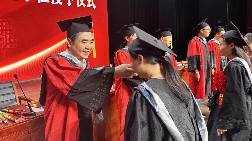 张聪宣读了《老太阳集团8722关于授予2024届本科毕业生学士学位的决定》,随后院长俞迎达及学位评定分委员会委员们分别为获得学士学位的全体毕业生正冠拨苏,授校长寄语,并合影留念。