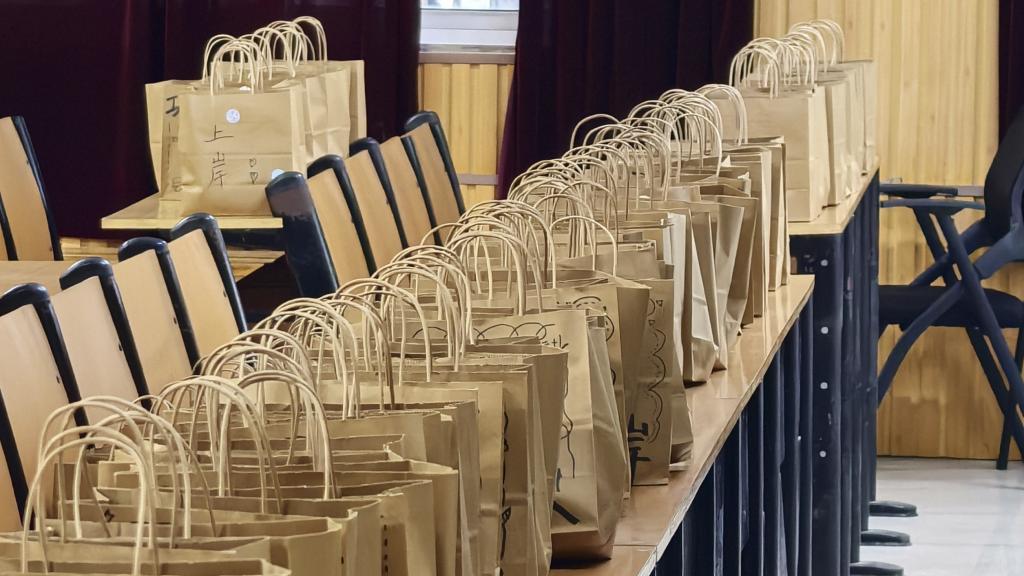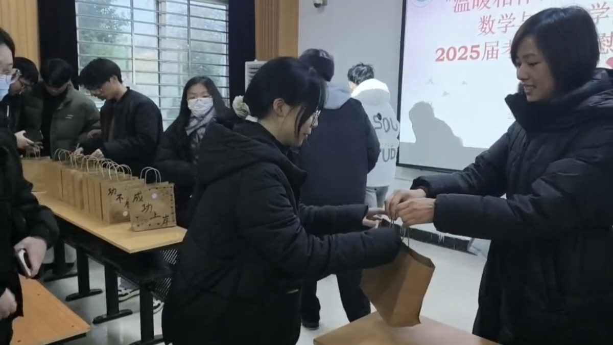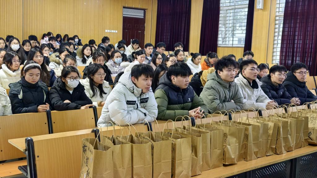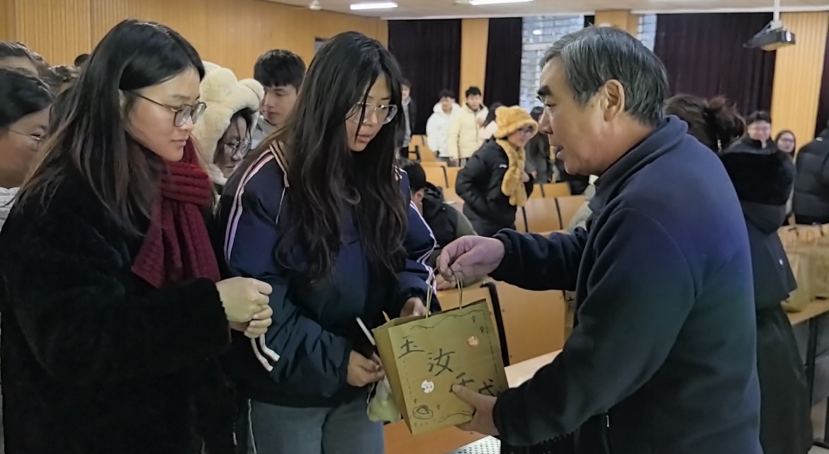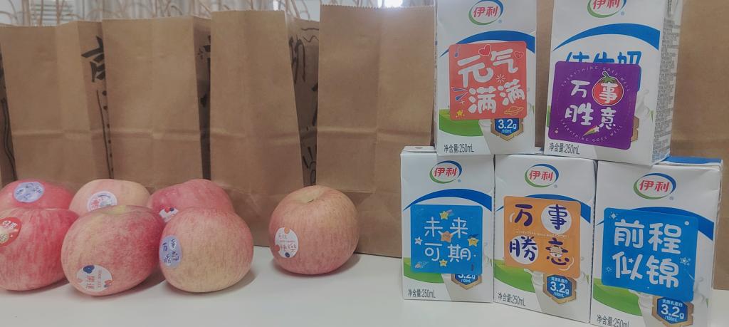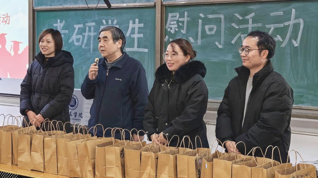 随后,学院领导老师为考研学子发放考研加油包,写满祝福语的袋子里装满了饱含学院牵挂的考研慰问品—红红的苹果祝福同学们“苹”稳上岸、营养的牛奶祝福同学们“乳”愿以偿、师生手写的爱心卡片祝福同学们万事顺心。