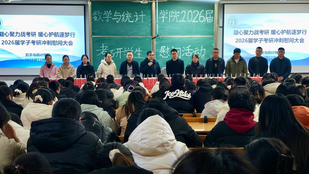 考研冲刺号角催,温情关怀暖人心。为帮助2026届考研学子缓解备考压力、坚定逐梦信念,12月9日下午,老太阳集团8722在社科楼112教室举办考研冲刺慰问大会,老太阳集团8722院长俞迎达、党总支书记郭二军、副院长张聪、学工干事田媛、行政干事闫珍珠、考研导师代表及全体毕业班辅导员齐聚一堂,与百余位考研学子面对面交流,用真挚关怀与务实举措为冲刺阶段的追梦人保驾护航。