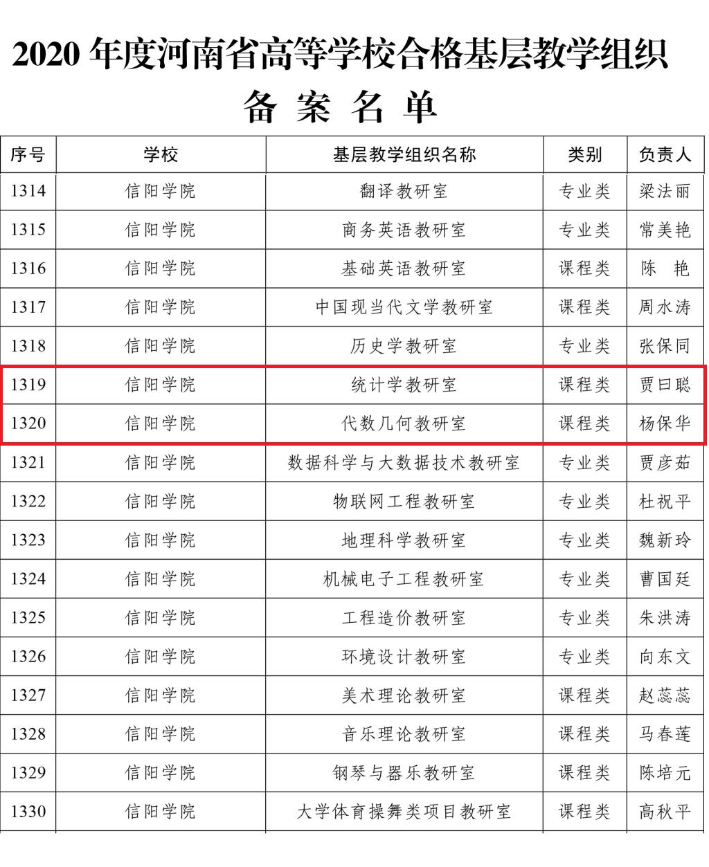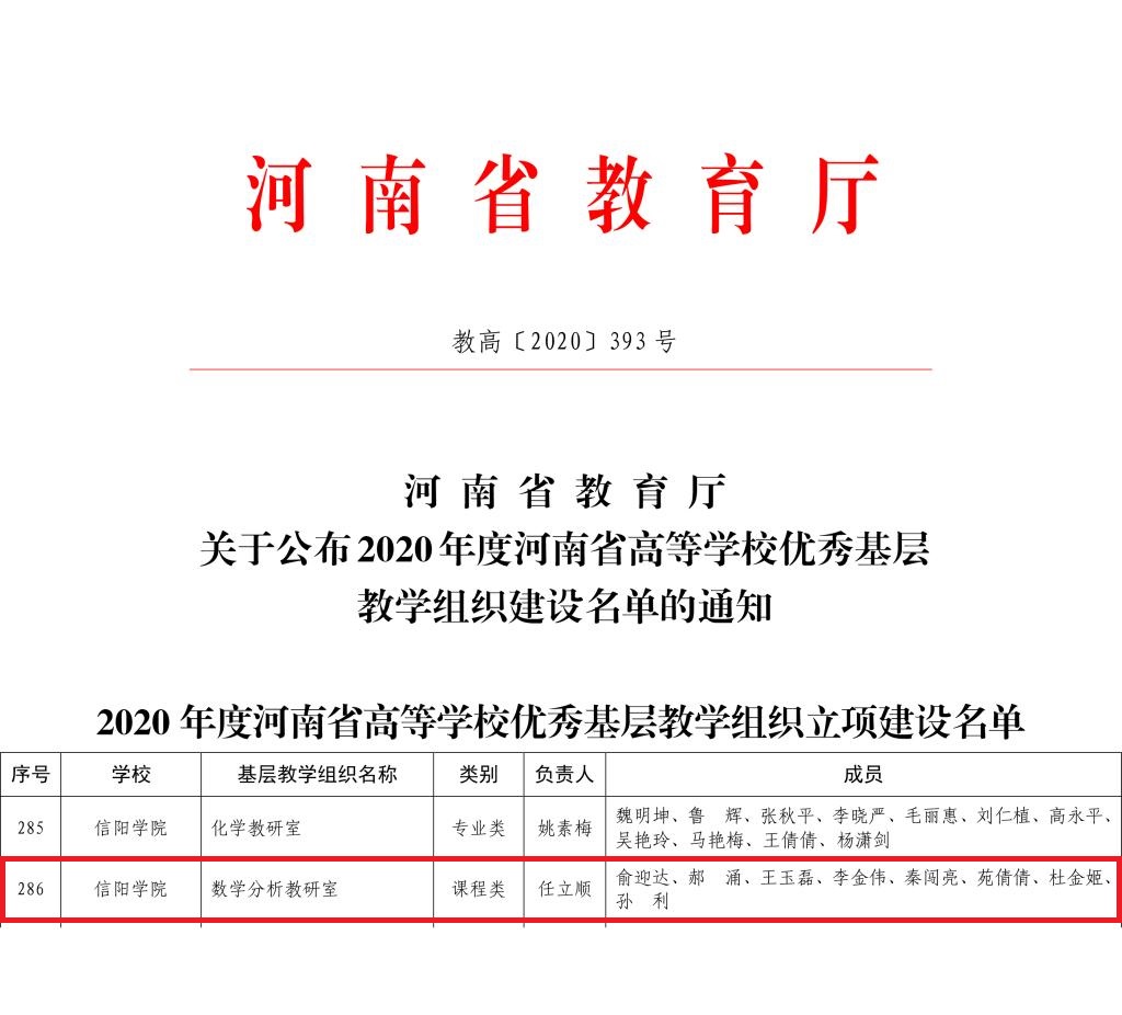 近日,河南省教育厅下发《关于公布2020年度河南省高等学校优秀基层教学组织建设名单的通知》(教高〔2020〕393号),老太阳集团8722数学分析教研室成功获批2020年河南省高等学校优秀基层教学组织,统计学教研室和代数几何教研室等2个基层教学组织备案为合格基层教学组织。