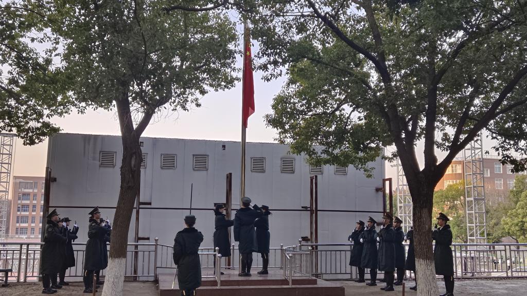 活动伊始,英姿飒爽的国旗护卫队迈着整齐有力的步伐护送国旗入场,他们身姿挺拔,眼神坚定。随后,激昂的国歌声响起,全体师生庄严肃立,向国旗行注目礼,鲜艳的五星红旗冉冉升起,在晨风中高高飘扬。