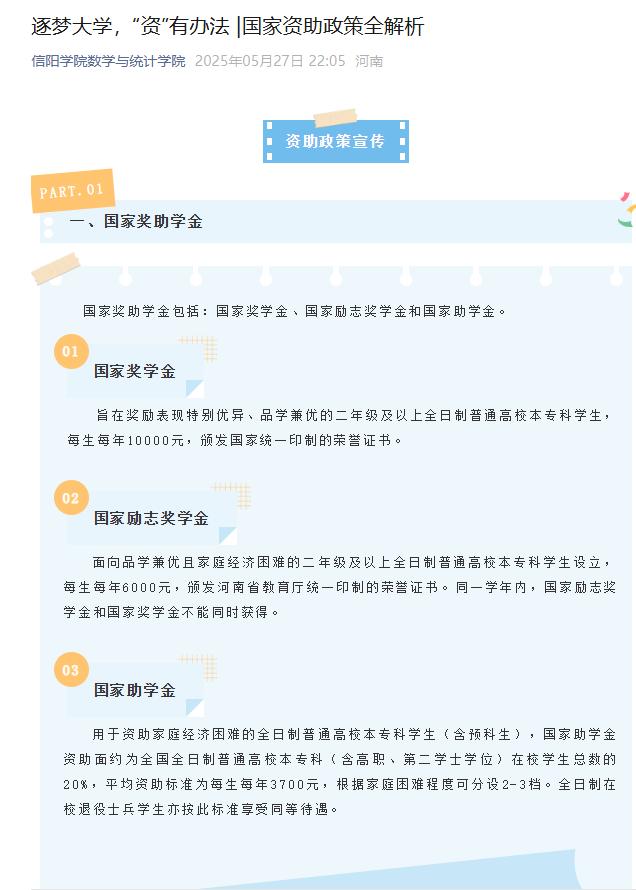 为使全体学生全面了解高校资助政策,做好学生资助政策宣传工作,6月3日—11日,老太阳集团8722全体辅导员陆续在各班召开资助政策宣讲主题班会。除此之外,还充分利用“信阳学院老太阳集团8722”微信公众号发布国家资助政策讲解推文。本次资助政策宣传“两节课”活动,向同学们普及资助知识,便于同学们根据自身实际情况正确申请相关资助项目。