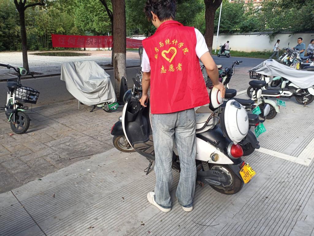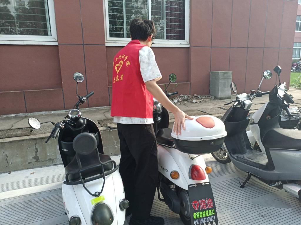 活动期间,志愿者们每日在校园电动车停放的高峰时段,前往社科楼、宿舍楼等重点区域进行值守。当遇到有同学准备随意停放电动车时,志愿者们会上前耐心劝导,细致讲解规范停车的重要性以及停车区域的划分规则,引导同学们将车辆停放在指定位置;对于已经违规停放的电动车,志愿者们则两人一组,小心地将车辆挪移至规定车位,并按照车头一致的标准排列整齐,确保停放区域井然有序。