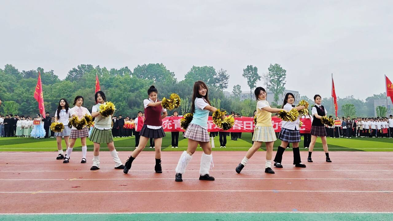 方阵中,一群同学化身“啦啦队少女”,手持金色花球活力热舞。她们动作整齐、笑容灿烂,用青春的律动点燃现场氛围,展现出学子活泼灵动的一面。