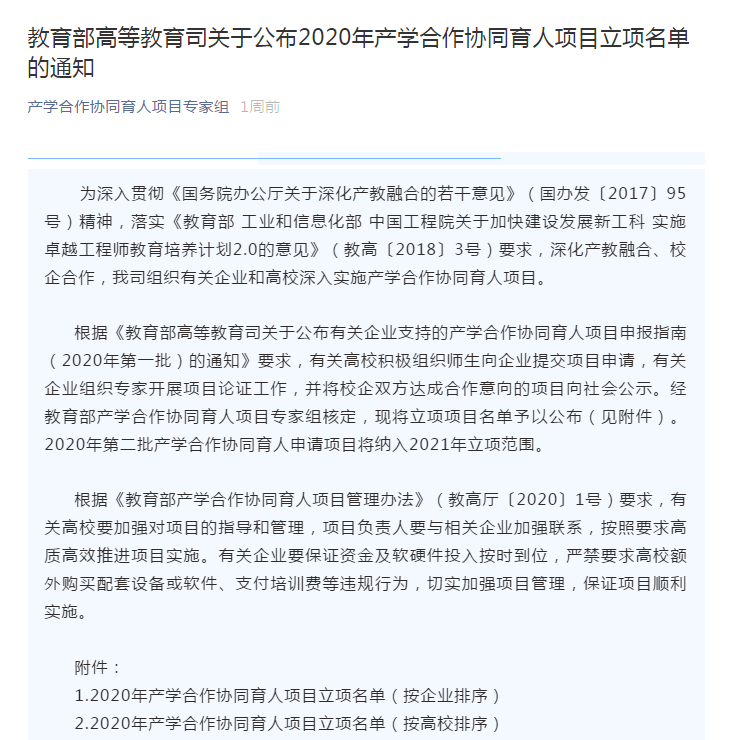 产学合作协同育人项目是为贯彻落实《国务院办公厅关于深化产教融合的若干意见》(国办发【2017】95号)和《关于加快建设发展新工科 实施卓越工程师教育培养计划2.0的意见》(教高【2018】3号)等文件精神,教育部高教司特组织有关企业支持高校共同开展产学合作协同育人项目,旨在通过政府搭台、企业支持、高校对接、共建共享,深化产教融合,促进教育链、人才链与产业链、创新链有机衔接,以产业和技术发展的最新需求推动高校人才培养模式改革。