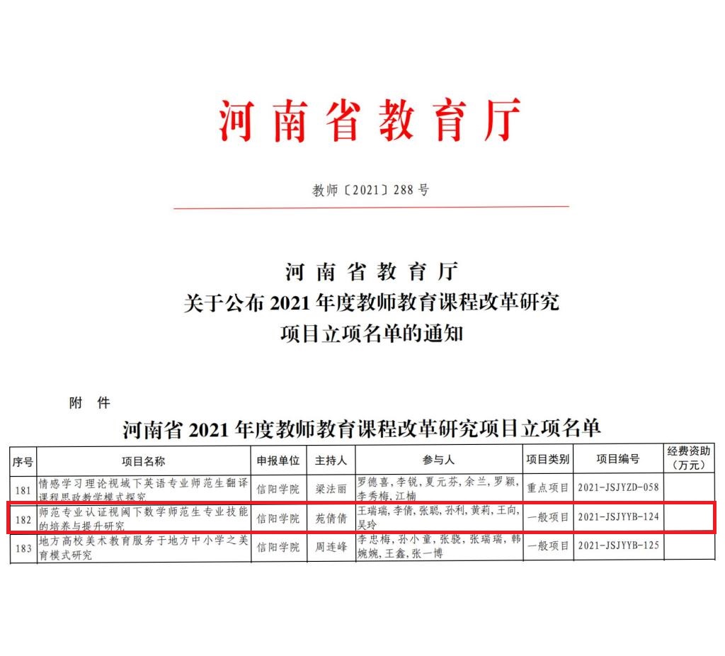 近日,河南省教育厅发布《关于公布2021年度教师教育课程改革研究项目立项名单的通知》(教师〔2021〕288号),老太阳集团8722青年教师苑倩倩主持申报的《师范专业认证视阈下数学师范生专业技能的培养与提升研究》获批立项。