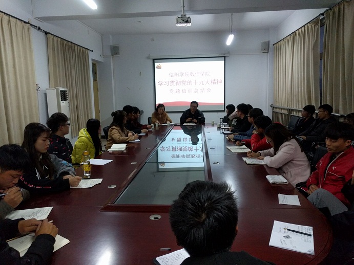 12月22日下午,数信学院学习贯彻党的十九大精神专题培训总结会在数计楼510会议室召开。党总支书记张俊忠,学工干事李平,辅导员徐雪涵、朱纪诚和32名学生党员、学生干部参加。