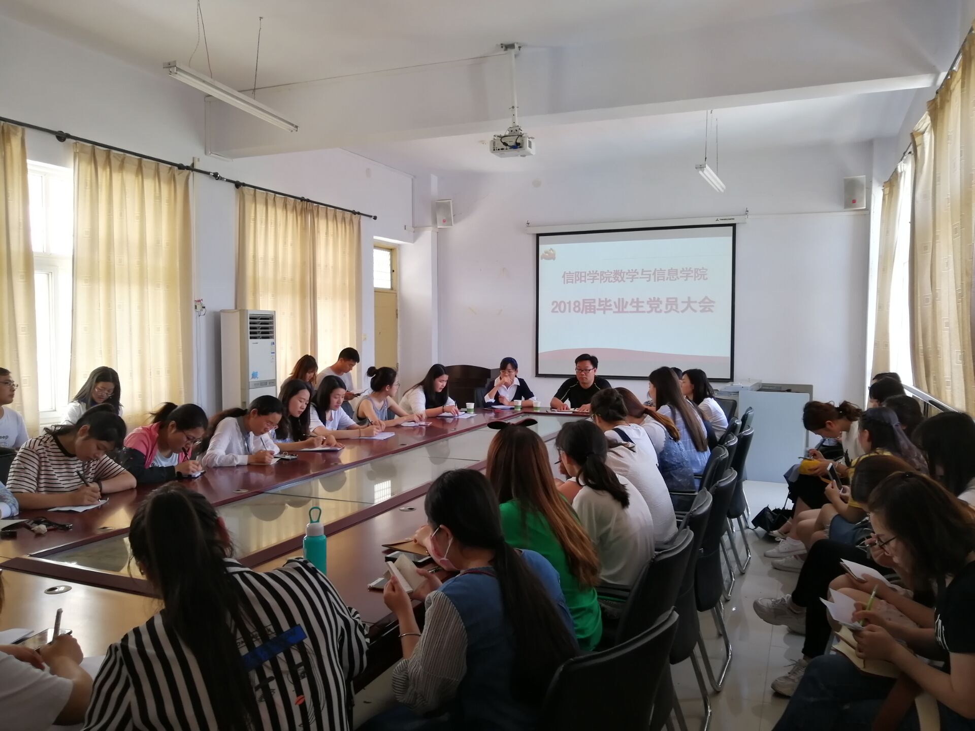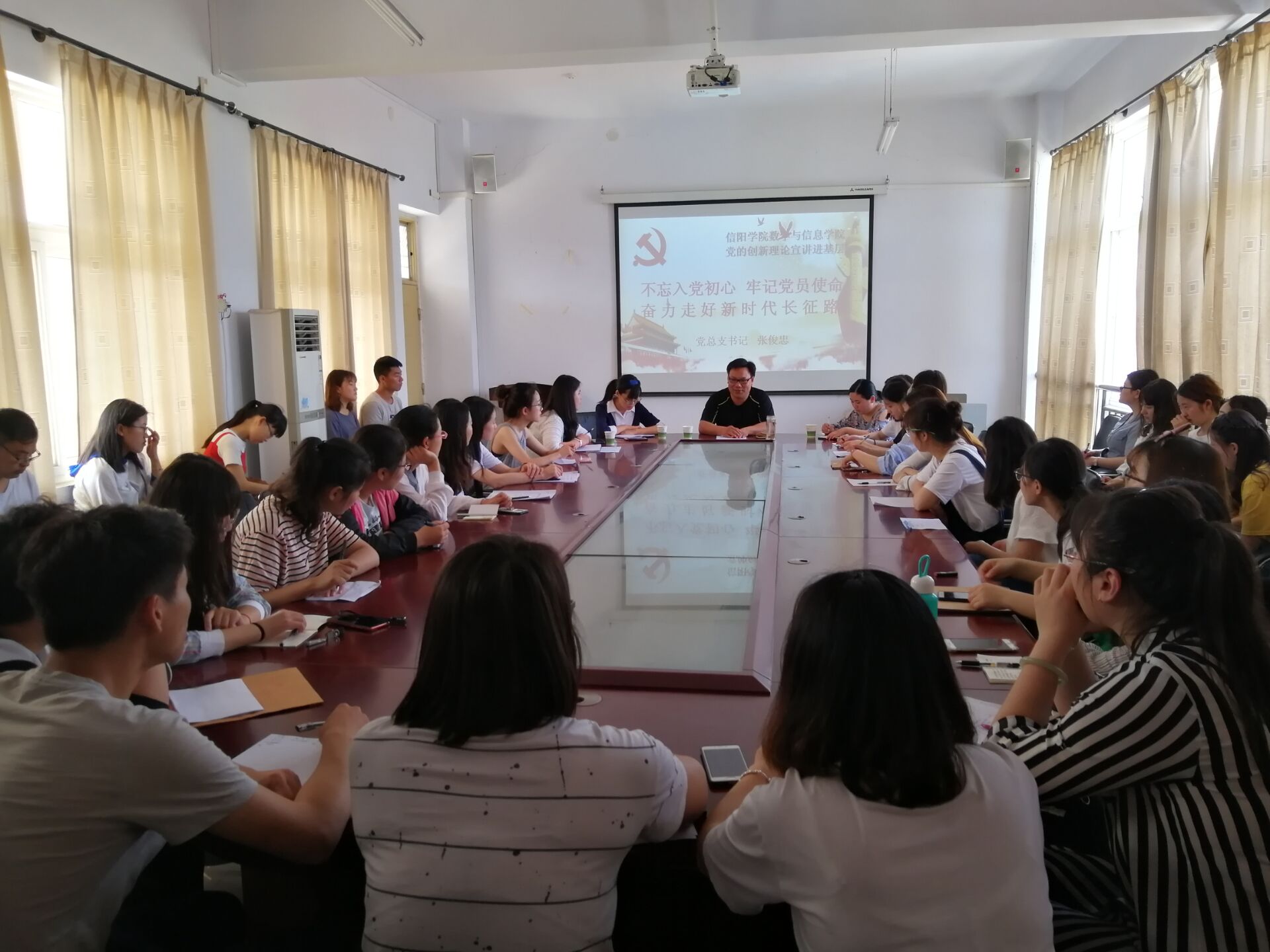 5月14日,数信学院2018届毕业生党员大会在数计楼510会议室召开。党总支书记张俊忠,学生一支部书记、辅导员司杰,学生二支部书记、辅导员何珊珊,辅导员徐雪涵和43名毕业生党员参加会议。会议由司杰主持。