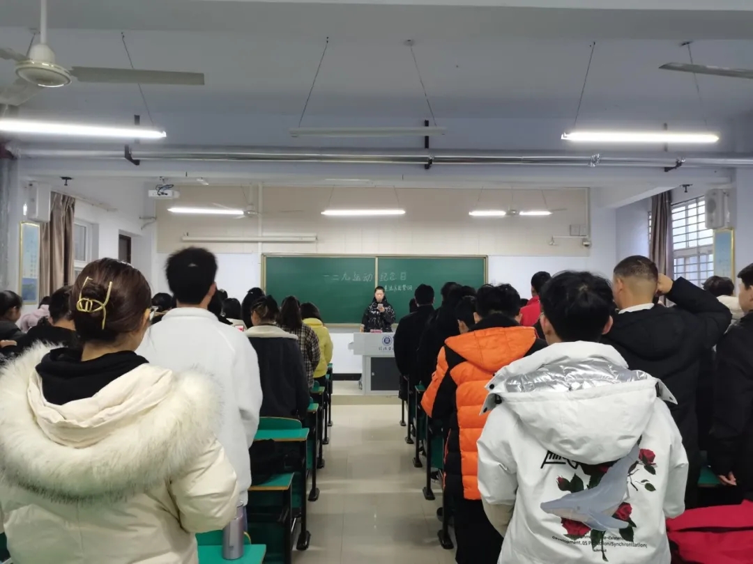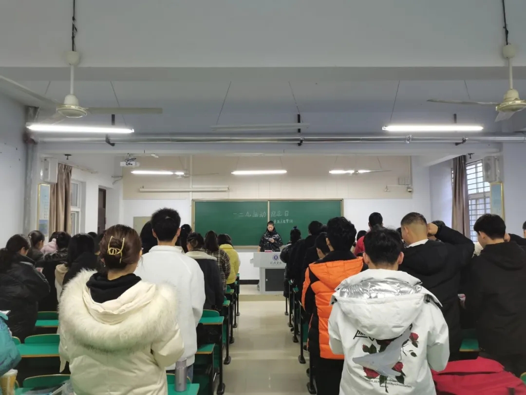 活动开始,全体学生起立齐唱国歌,赞扬抗日青年。接着由各班级团支部书记带领同学们回忆1935年12月9日的“一二·九抗日救亡运动”,并为同学们讲述一二九学生爱国运动的历史意义,同时引导同学们树立远大理想,心怀爱国情怀。活动最后,全体学生重温了入团誓词。