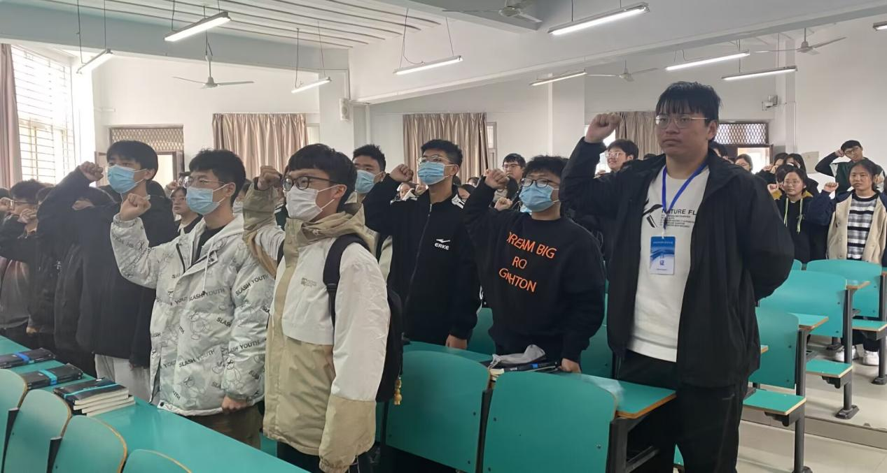 首先,学院团总支副书记于华强带领团员代表重温入团誓词,让每一位同学都能在这庄严神圣的氛围中,接受思想的洗礼和升华,始终不忘入团初心,更加深切地感受到作为一名共青团员应具备的先进性与责任感。以重温入团誓词的方式,认真学习团的章程和系列决议的精神,感悟其中所蕴含的时代精神和时代责任,以数统人之名,宣青春之誓言。