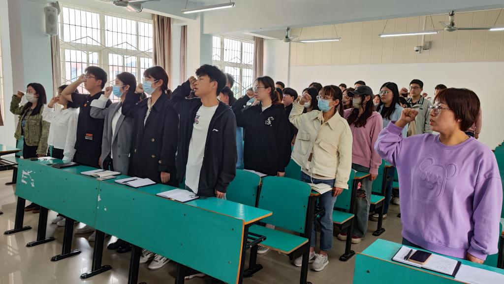 范学琴带领预备党员进行入党宣誓,全体党员重温入党誓词。