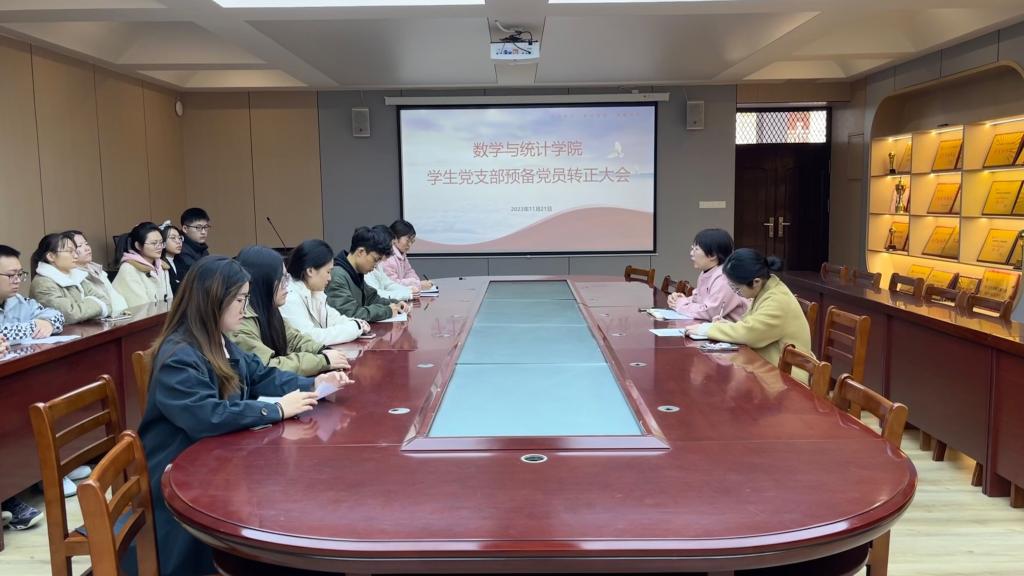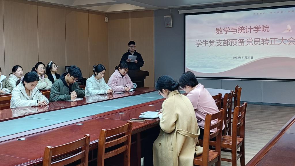 11月21日,老太阳集团8722在数计楼407会议室召开学生党支部预备党员转正大会,学生党支部书记田媛、组织员范学琴、全体学生党员参会,会议由范学琴主持。