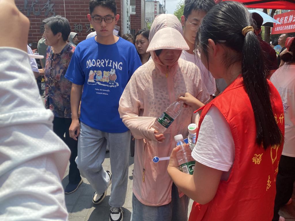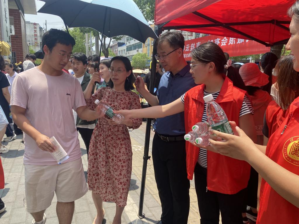 在信阳市第十三小学(湖东校区)服务点,我院入党积极分子协助搭建爱心帐篷,发放免费饮用水,同时,积极配合考场工作人员进行交通疏导、秩序维护,为广大考生营造了安静、和谐、便捷、舒心的考试环境。