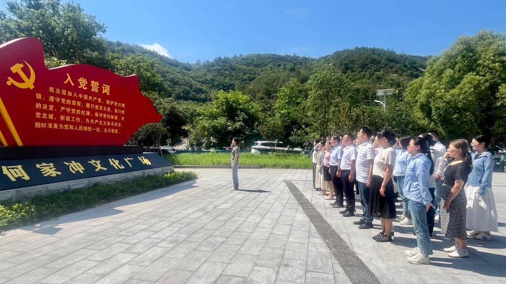 面对鲜红的党旗,党总支书记高昌慧带领全体党员高举右拳,重温入党誓词。铿锵有力的誓言在广场上回荡,表达了党员们严守纪律规矩,以优良作风践行初心使命的决心。