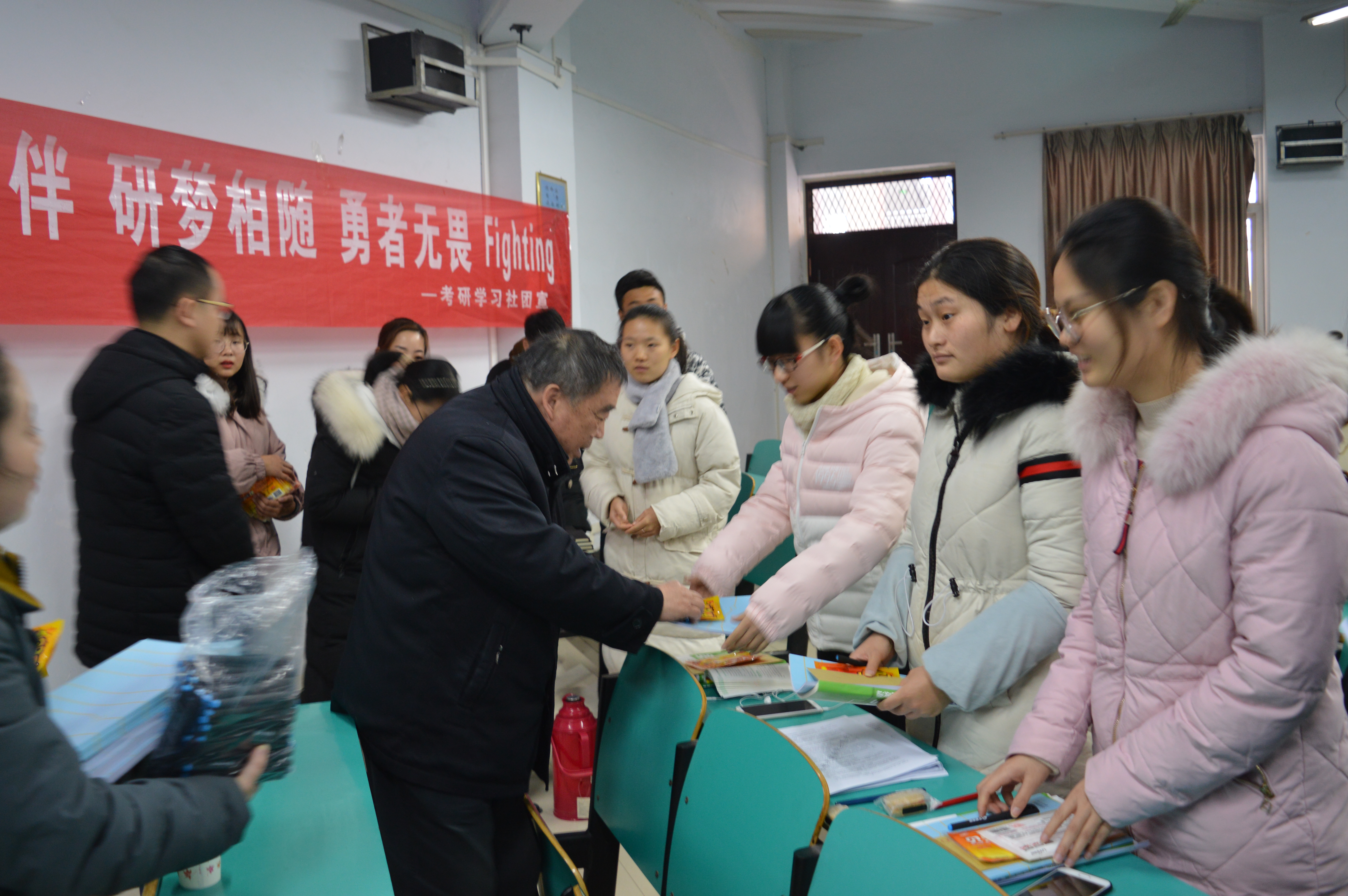 俞迎达、郝涌分别从临考复习方法、心态调整、出行安全,考前冲刺等方面对学生进行了指导;李平针对考试期间注意事项进行了解答。随后,俞迎达、郝涌等为考研学子发放了暖贴、精美笔记本、英语真题等物品。