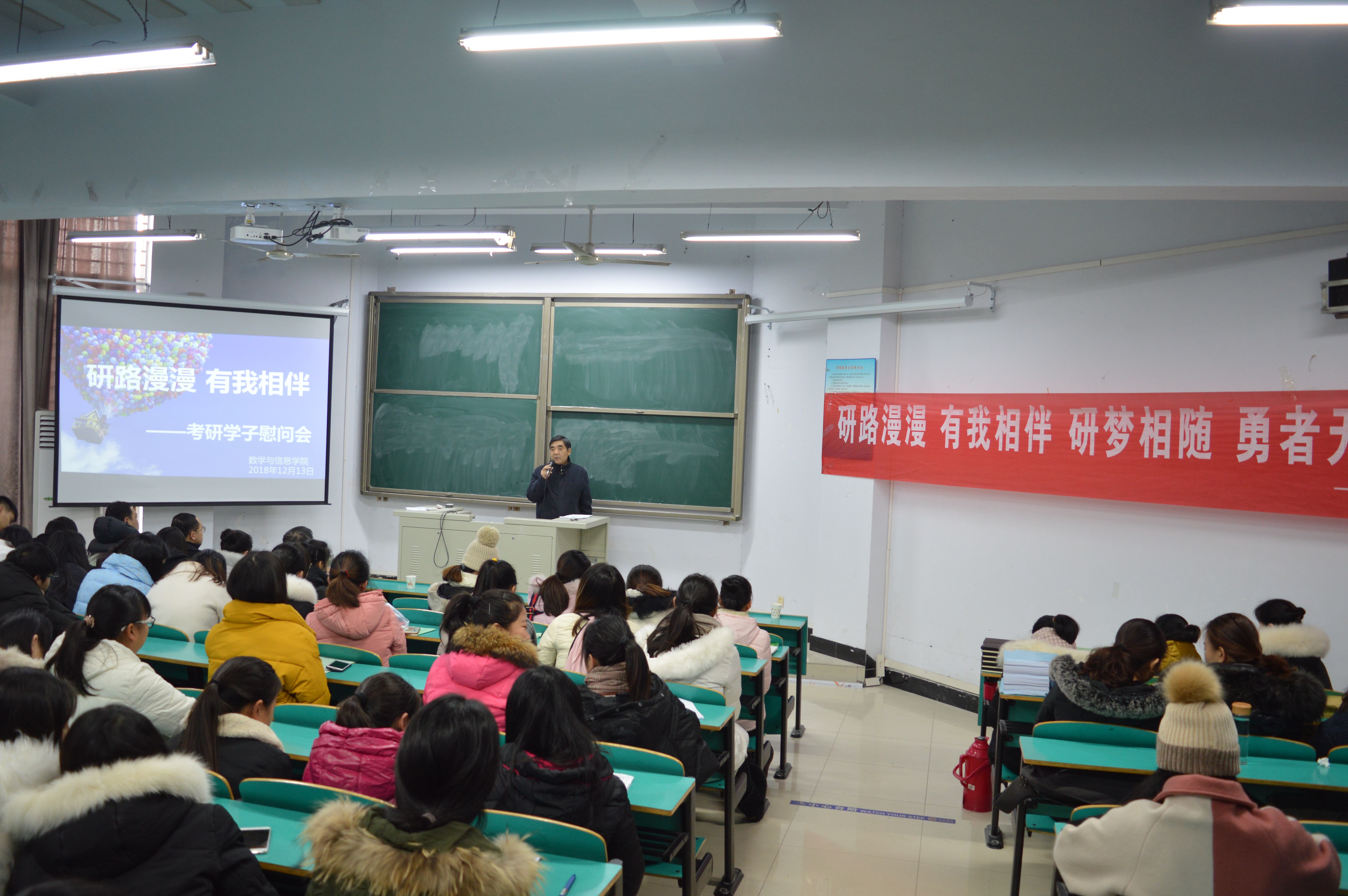 12月13日上午,数学与信息学院在数计楼106室举行“研路漫漫,有我相伴”考研学子慰问活动。院长俞迎达、特聘教授郝涌、学工干事李平、团总支书记王晶、全体辅导员及2019届全体考研学子参加了本次活动。活动由辅导员徐雪涵主持。